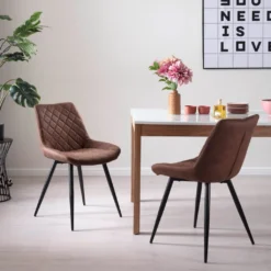 2er Set Esszimmerstühle Wildlederoptik DUNKELBRAUN Rautensteppung Metallfüße Schwarz