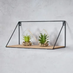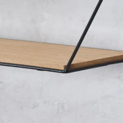 – Wandregale mit mattschwarzen Metallstreben und natĂĽrlicher Holzoptik