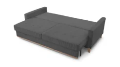 Bequeme Rückenkissen und zusätzliche Lendenkissen machen die Couch äußerst bequem, während die ausklappbare Schlaffunktion und ein geräumiges Bettkasten für die Funktionalität des Möbels sprechen. Der Charakter der Couch wird durch eine Holzleiste in Naturfarbe betont.