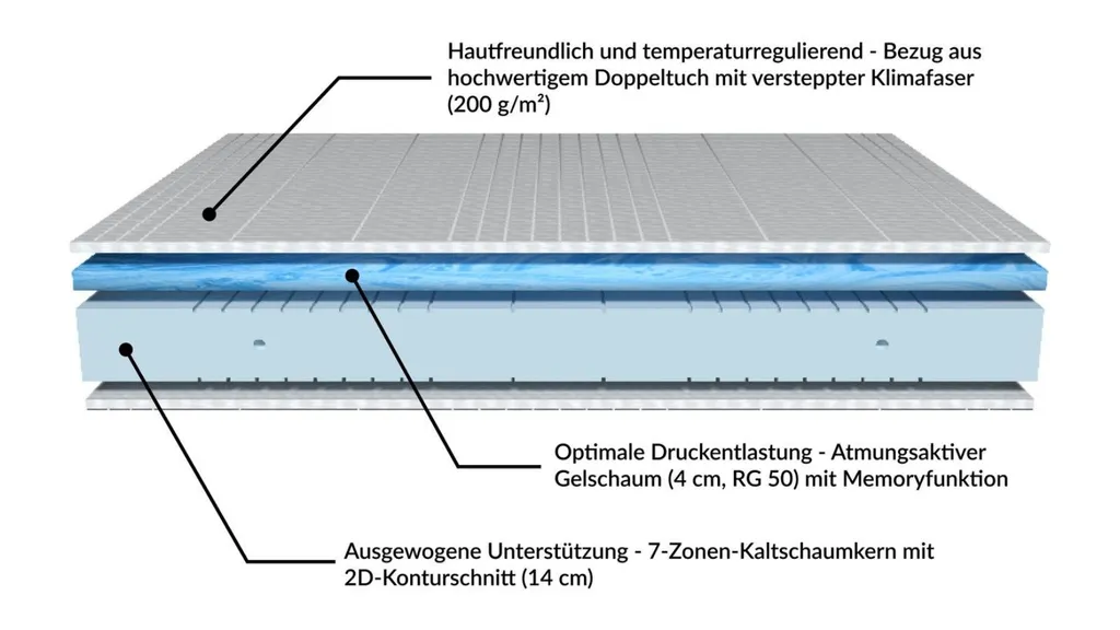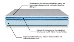 Die Gelschaummatratze (140×200 cm, H2 – 20 cm) von AM Qualitätsmatratzen zeichnet sich besonders durch ihren einzigartigen Aufbau aus. So bildet ein 14 cm hoher 7-Zonen-Kaltschaum mit 2D-Konturschnitt das Herzstück der Matratze. Eine 4 cm hohe Schicht aus Gelschaum mit RG50 gibt unserer Gelmatratze ein angenehm weiches Liegegefühl und sorgt für eine optimale Druckentlastung der Wirbelsäule.