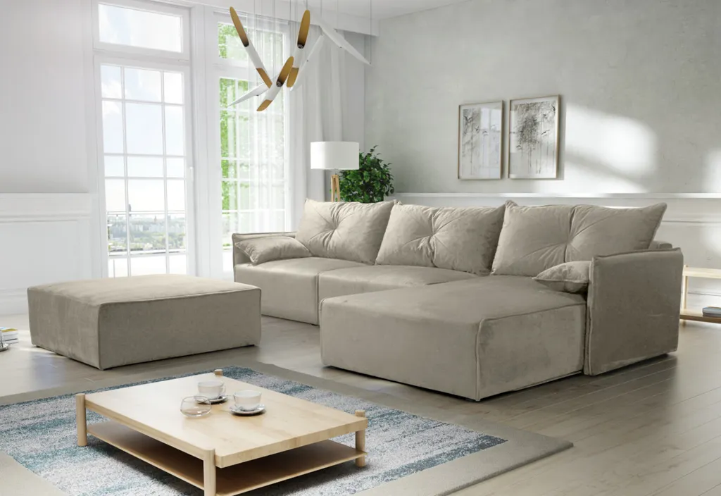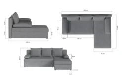 Eckschlafsofa STALONE 2. Es hat viele Vorteile, zu denen sicherlich sein Ausziehmechanismus gehört. Dank ihm kann man es im Handumdrehen in ein Bett für gelegentliche Übernachtungen umwandeln. Der Sitz ist mit einer Kombination aus PUR-Schaum und Faliste-Federn gefüllt. Die gesamte Oberfläche, einschließlich der Rückseite, ist mit Stoff bezogen. Die Konstruktion besteht aus einem robusten Massivholzrahmen. Sie können aus mehreren Polsterungsfarben und Eckausrichtungen wählen. In der Konfiguration können Sie ein Taburett als zusätzliches Zubehör wählen.