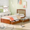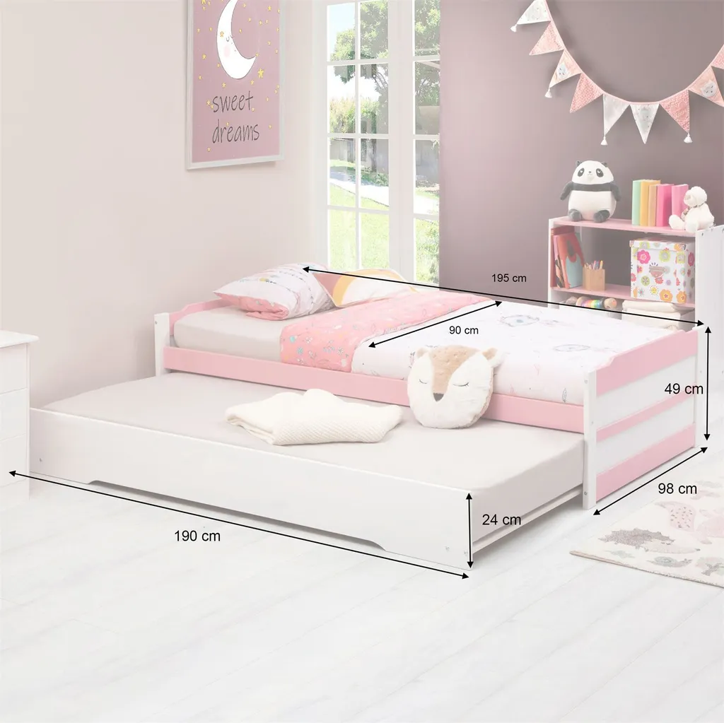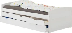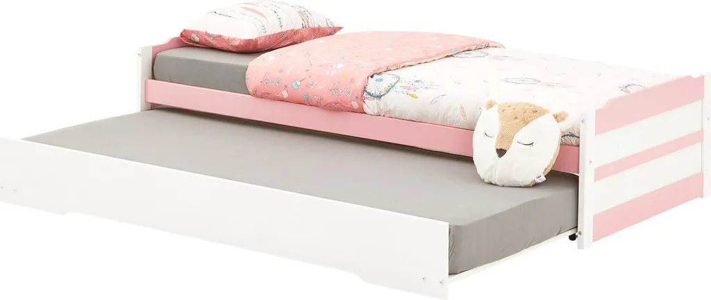 ist ein echtes Bettwunder. Mit der zusätzlichen Gästeliege, die sich ganz einfach ausziehen lässt, schaffen Sie eine Schlafgelegenheit für einen Übernachtungsgast. Aber nicht nur funktionell punktet das Bett, sondern auch optisch macht es was her. Das Grundgestell ist aus massivem Kiefernholz gefertigt und in den Kopf und Fußteilen sind lackierte MDF Platten eingearbeitet.