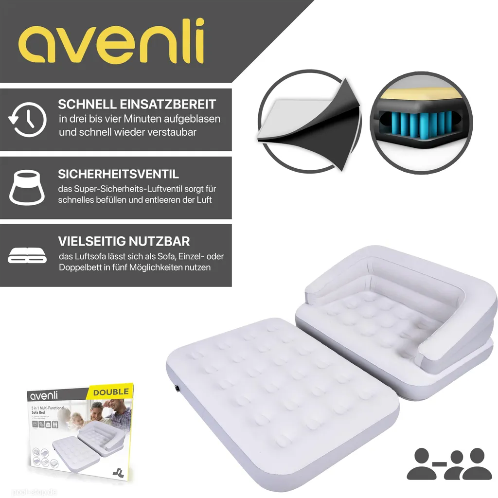 Durch die Zeitlosigkeit von Farbe und Design ist diese Sitz- und Schlafkombination für Jung und Alt geeignet. Eine idealer Gelegenheit zum Zurücklehnen und Entspannen. Ob Zelten, Festival, Urlaub, Strand, Ferienlager, Camping, Wohnmobiltrips – dieses moderne aufblasbare Multitalent ist vielseitig einsetzbar und verschönert jedes Gästezimmer. Das Sofa ist schnell aufgeblasen und im nu zur Schlafcouch umgebaut.