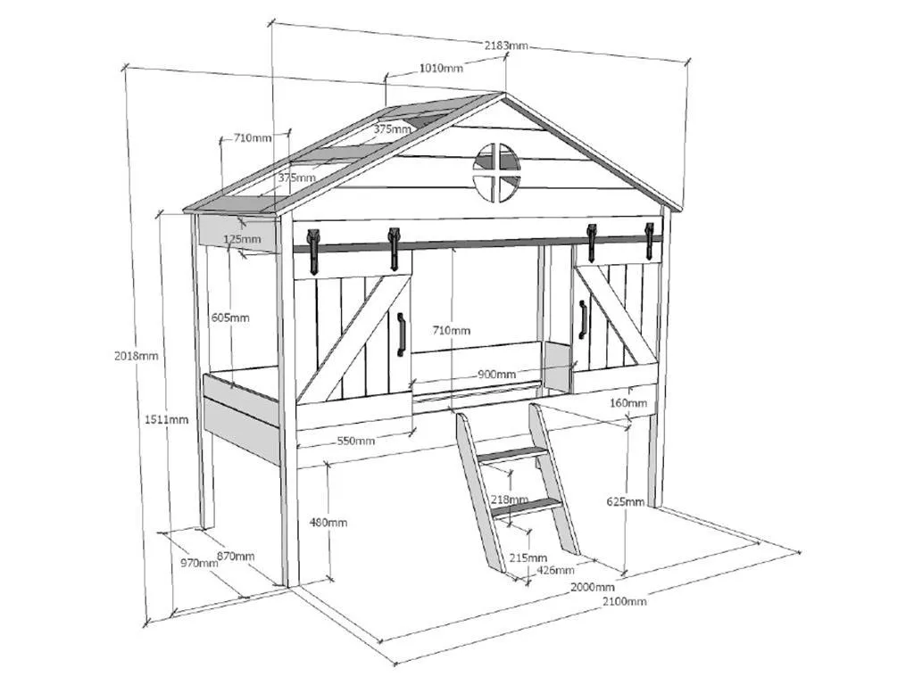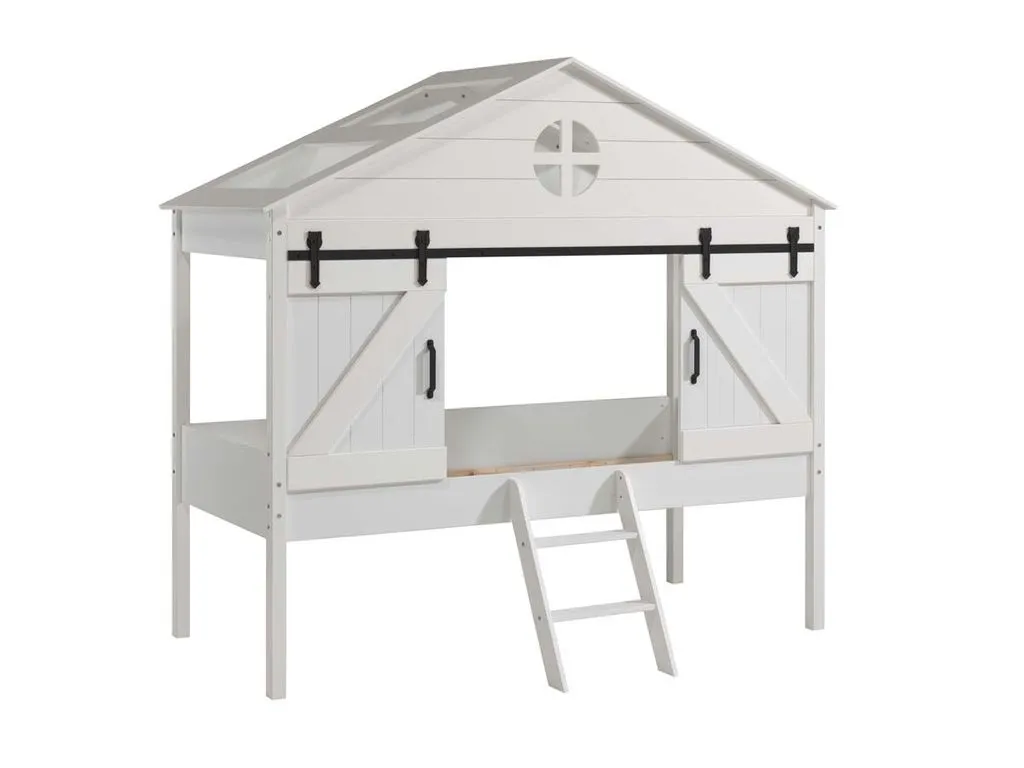 Halbhohes Bett in Farm einer Scheune, weiss lackierte Kombination aus massiver Kiefer und MDF. In dieses Bett passt eine Matraze von 90 x 200cm.Hier finden Sie die authentischen Bauernhofelemente wie die bekannten Bauernhoftüren mit Schiene. Das schöne runde Fenster über der Tür und die Leiter runden das Bild ab. In dieses Bett passt ein Rolllattenrost.