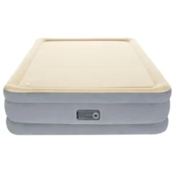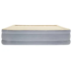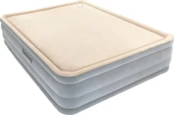 Beschreibung : – Luftmatratze – Aufblasbare Struktur aus Vinyl – 2 Personen – Anwendung : im Innenbereich -152 x 203 x 46 cm – Beflockte Fläche – Anti-Kipp Design – Überzug aus weichem Schaum – Integrierte elecktrische Luftpumpe (220-240V) – Bläst sich in 270 Sekunden auf. – Plafster und Travel Bag inbegriffen.