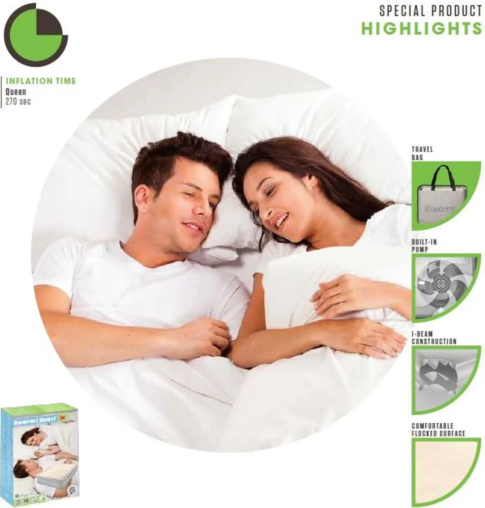 Super bequemes und praktisches Premium Queen Size Gästebett / Velourbett für Camping, Freizeit und zu Hause von Bestway, einem der weltweit größten Hersteller von Luftbetten.Jedes Gästebett wird einem 24-Stunden-Aufblastest unterzogen, bevor es verpackt wird. Die eingebaute elektrische 220V-Hochleistungspumpe übernimmt das schnelle Aufpumpen und Absaugen und ist bequem bedienbar. Das Gästebett ist nicht zum Dauergebrauch geeignet.