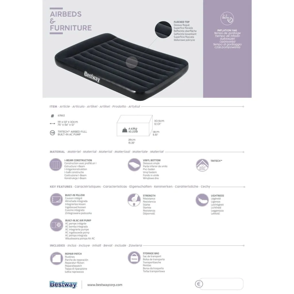 Wachen Sie mit dem Tritech™ Luftbett von Bestway® frisch und ausgeruht auf! Das 30 cm hohe Full-Size-Bett ist stabil, lange haltbar und die ganze Nacht lang unglaublich bequem. Mit den kompakten Maßen und der Pumpe ist das Bett schnell aufgebaut, wo immer Sie es brauchen.Stabile KonstruktionMit der angenehmen Liegefläche, der stabilen Konstruktion und einem integrierten Kissen wartet eine wunderbare Nacht auf Sie. Innen besteht das Bett aus strapazierfähigem Tritech™, das Stabilität verleiht, aber auch dafür sorgt, dass die Matratze die Form behält, egal wie häufig sie aufgepumpt und entleert wird. Beim Design wurde besonderer Wert auf den Erhalt der Härte gelegt und der Luftverlust in der Nacht minimiert. Das Premium-Material erhöht die Steifigkeit im Inneren der Matratze und bietet die ganze Nacht lang körpergerechten Halt. Das robuste, auf Belastbarkeit geprüfte Material absorbiert das Gewicht und die Bewegungen eines entspannten und erholsamen Schlafs.Einfacher AufbauDas Luftbett ist innerhalb von zwei bis drei Minuten aufgepumpt und bereit, wenn Sie es sind. Es wird mit der integrierten Pumpe aufgeblasen und mit dem Schraubventil nach der Verwendung schnell und einfach entleert. Dann verstauen Sie das nun flache Bett in der mitgelieferten Tragetasche und können es mühelos transportieren und lagern.