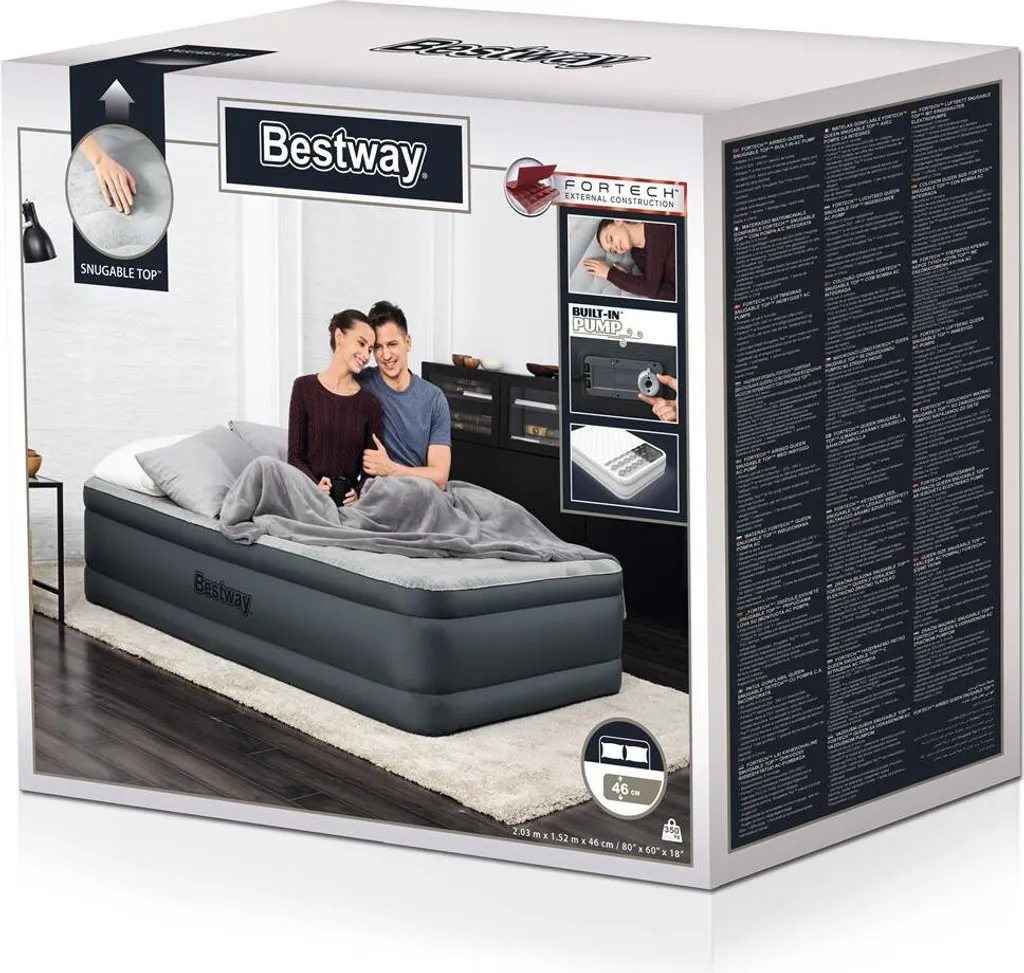 Das strapazierfähige und komfortable Luftbett Fortech™ mit Snugable Top™ von Bestway® hat eine besonders belastbare Oberfläche, die sich super weich anfühlt! Das 46 cm hohe Bett ist hart im Nehmen und gleichzeitig besonders leicht, was es zu einer hervorragenden Wahl für Sie macht. Stabile Konstruktion: Das Luftbett besteht aus Fortech™ und besitzt daher eine überaus lange Lebensdauer. Die Verbindung von PVC und Polyester lässt nicht nur eine besonders komfortable Liegefläche entstehen, sie ist auch robuster als herkömmliches PVC, und das bei zehn Prozent weniger Gewicht. Das strapazierfähige Material ist 75 Prozent beständiger gegen Löcher und 150 Mal reißfester. Dank des Textilgewebes wird das Bett in der Nacht weder zu warm noch zu kalt, was häufiger bei Betten aus PVC zu beobachten ist. weiche Oberfläche: Mit seiner Snugable Top™-Oberfläche ist dieses Bett genauso weich wie robust. Die weiche Oberfläche fühlt sich kuschelig an und hält die Körperwärme die ganze Nacht lang konstant. Mit seiner extra weichen Oberfläche bietet das Luftbett Snugable Top™ Ihnen und Ihren Gästen unvergleichlichen Komfort.