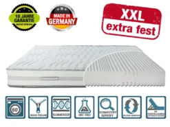Die Qualitätsmatratze bmm.komfort XXL zeichnet sich besonders durch ihre extrem hohe Festigkeit und der präzisen, perfekt abgestimmte SchulterPLUS Zone aus. Diese trägt dazu bei, allen Schläfertypen selbst bei einem hohen Festigkeitsgrad ein außergewöhnliches Schlaferlebnis zu ermöglichen und damit die notwendige Entlastung und Regeneration der Wirbelsaule in der Nacht zu fördern. Der leistungsfähige KS-Schaum ist offen-porig, vergleichbar mit einem Naturschwamm, fördert damit einen optimalen Feuchtigkeitstransport und eine hohe Luftdurchlässigkeit, was Schweißbildung und Milbenbefall entgegenwirkt. Der hochatmungsaktive 3D-Klimaband SilverCare Border Bezug ist für Allergiker geeignet, strapazierfähig, mit einem reißfesten Reißverschluss ausgestattet und somit leicht abnehmbar.