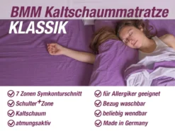Die Qualitätsmatratze bmm.klassik XXL 19 V2 mit einer Gesamthöhe von 19cm zeichnet sich besonders durch ihre extra feste Ausführung und der perfekt abgestimmten 7-Zonen Symkonturschnitte aus. Diese tragen dazu bei, allen Schläfertypen (egal ob Seiten-, Rücken- oder Bauchschläfer) ein außergewöhnliches Schlaferlebnis zu ermöglichen. Durch die Zonierung erhält die Wirbelsäule die notwendige Entlastung und Regeneration in der Nacht.