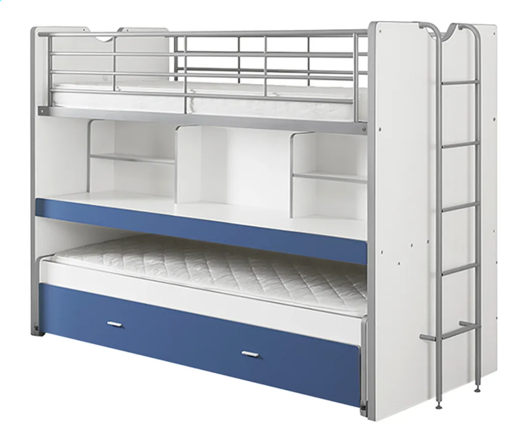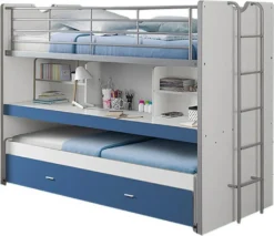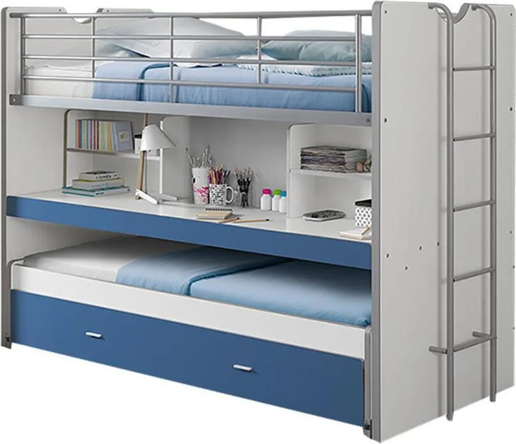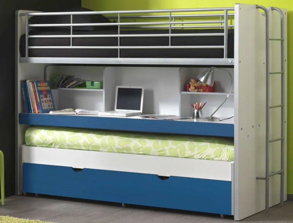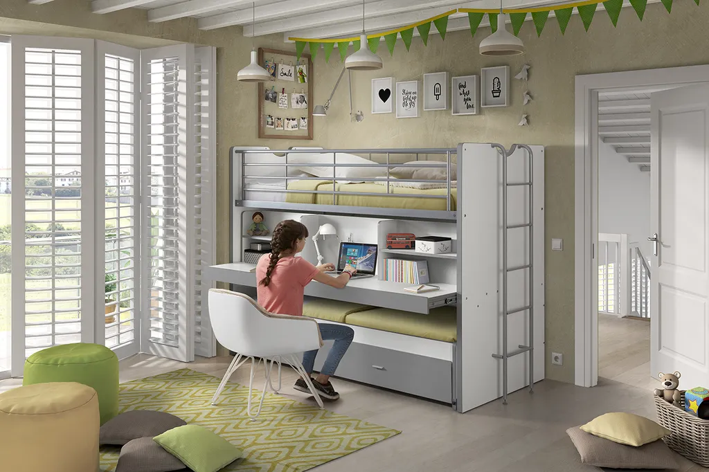 Kein Platz für Hausaufgaben… diese Ausrede gilt hier nicht! Dieses Hochbett | Etagenbett Bonny ist ein wahres Verwandlungstalent. Tagsüber kann der Schreibtisch rausgezogen und genutzt werden und nachts finden bis zu 3 Personen Platz in diesem Bett.