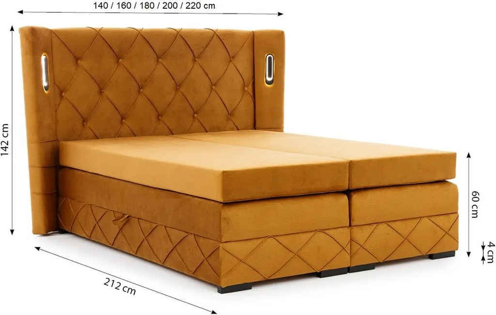 Das Kontinentalbett Neria Lux ist in verschiedenen Farben und Größen erhältlich, was bei der Wahl des richtigen Modells viel Komfort bietet. Es hat ein schönes gestepptes Kopfteil mit Beleuchtung an den Seiten, was diesem Möbelstück einen einzigartigen Charakter verleiht.