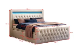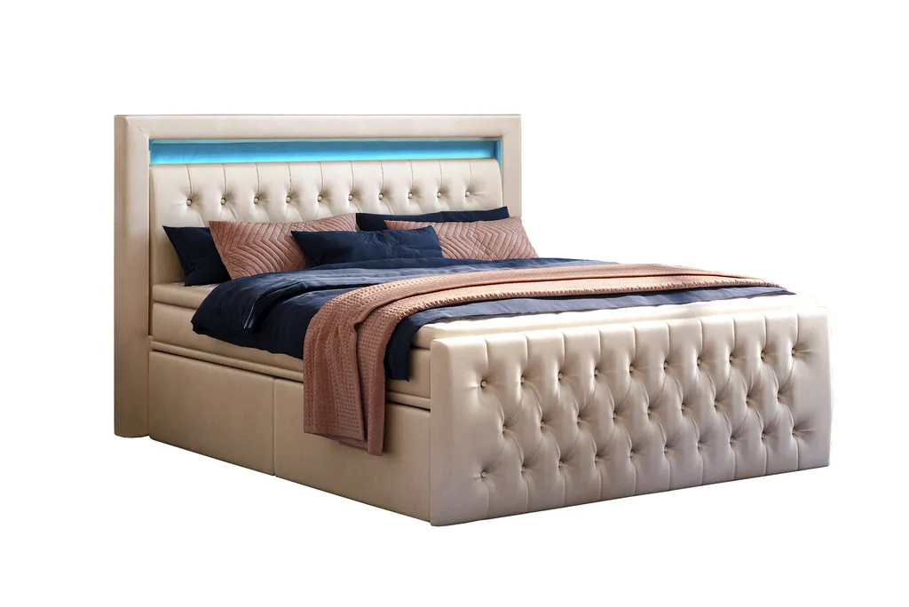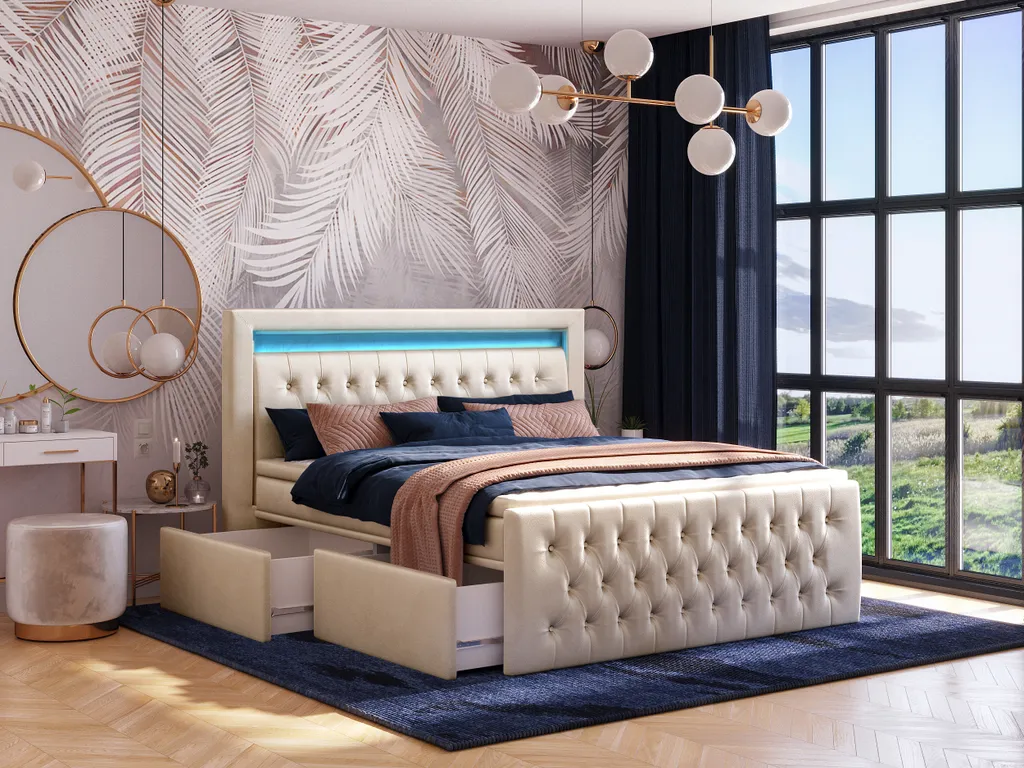 Mit diesem hochwertigen Doppelbett können Sie Ihr Schlafzimmer individuell einrichten. Das Boxspringbett Cezar ist eine perfekte Kombination aus klassischem und sehr modischem Design mit Funktionalität. Die zwei Bettkasten sind auf jeder Seite in je zwei Schubladen unterteilt. Diese erleichtern den täglichen Gebrauch. Sie müssen keine Kraft aufwenden, um die Schubladen zu öffnen und zu schließen. Das schöne Kopfteil, in modernem Design sorgt mit der integrierten LED-Beleuchtung für besonderen Charme. Die zwei Bonell-Matrazten ink. des Toppers, sorgen für einen erholsamen schlaff. Durch die verbauten Werkstoffe verfügt das Polsterbett über Zuverlässigkeit und Langlebigkeit.