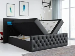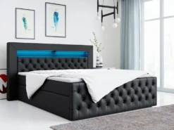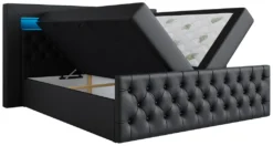 Das Boxspringbett mit mehreren Aufbewahrungsmöglichkeiten ist aus stabilen und extrem langlebigen Materialien gefertigt und wird standardmäßig mit einem doppelten Aufbewahrungskasten und einer PREMIUM-Matratze geliefert.
