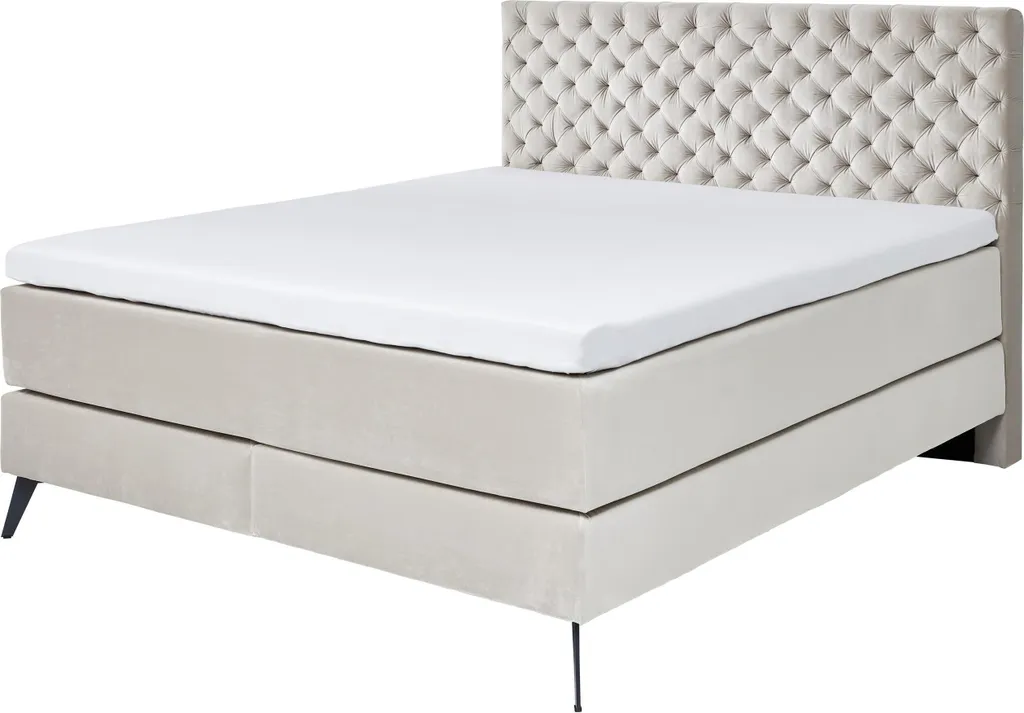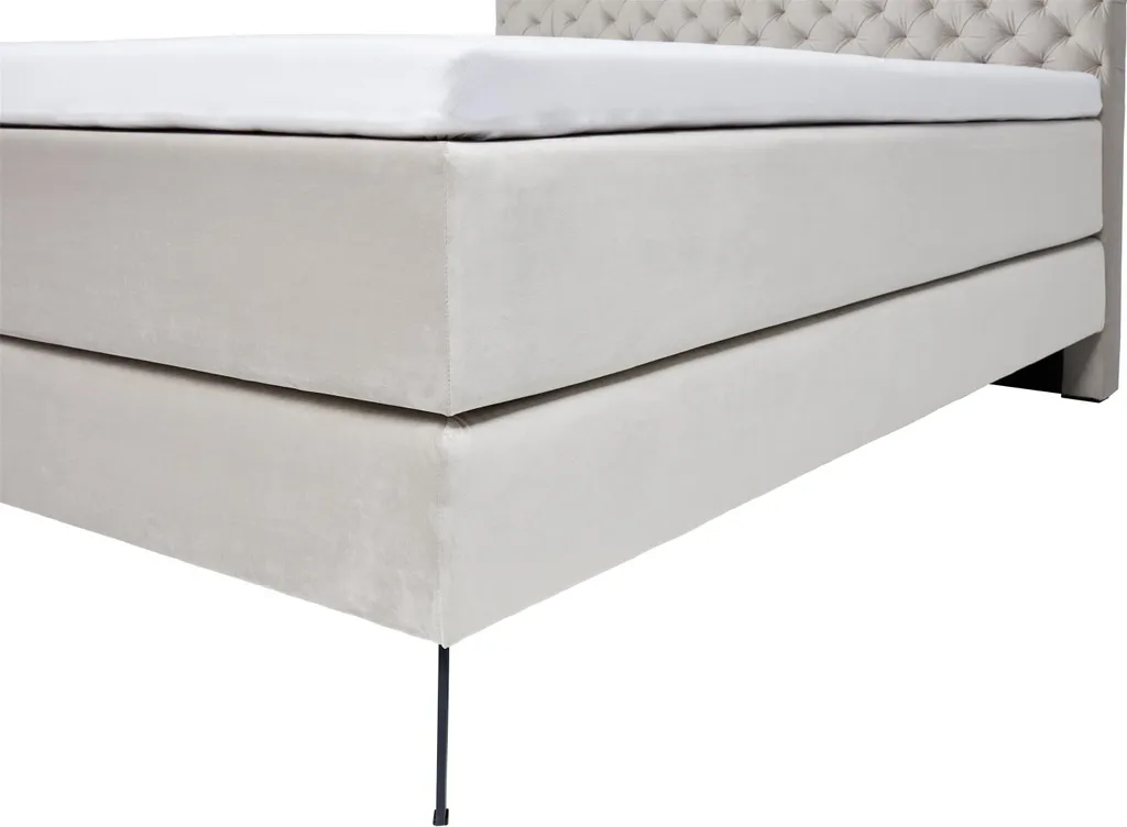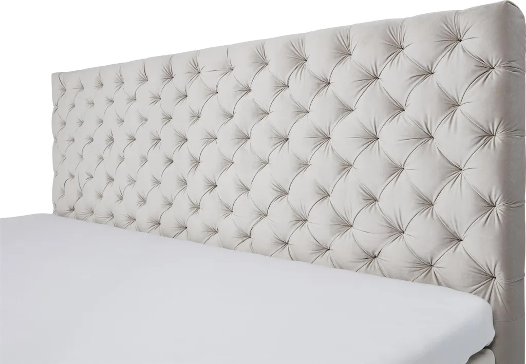 Das Boxspringbett im Samtstoff mit gestepptem Kopfteil, ist auf einem hochwertigen Holzrahmen mit Bonnell-Federkern und einer 7-Zonen-Tonnentaschenfederkern-Matratze (TTFK 350) mit optimaler Körperanpassungsfähigkeit und hervorragender Punktelastizität durch sensible Federn, die einzeln in Taschen eingenäht sind. Bonell-Federkern-Höhe: ca. 20 cm, Matratzen-Härtegrad: H3, Höhe: ca. 25 cm, Belastbarkeit: 240 Kg, Liegehöhe: ca. 58 cm + Topper, Kopfteilhöhe: ca. 130 cm, Stellmaß LxBxH ca. 211x182x130 cm