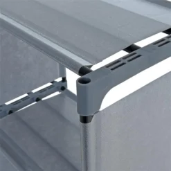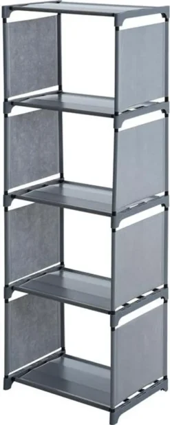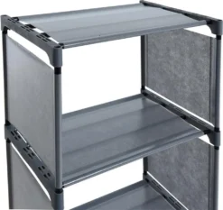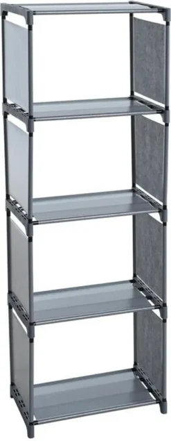 Unser praktisches Regal ist perfekt für den Flur, Keller oder Campingurlaub. Es ist sehr leicht und somit einfach zu Transportieren – trotzdem hat es durch die beiden zusätzlichen Zwischenstreben in den Böden eine hohe Stabilität. Das Regal besteht aus schwarzen, lackierten Metallrohren und die Regalböden und -wände sind aus beschichtetem Vlies-Stoff. Durch die Beschichtung ist das Regal sehr pflegeleicht und schnell und einfach zu reinigen.