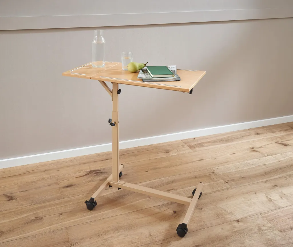 Bei Nichtgebrauch können Sie den Beistelltisch dank der Doppellaufrollen bequem zur Seite schieben. Zwei dieser Laufrollen lassen sich feststellen, um ein Wegrollen bei der Nutzung zu verhindern.