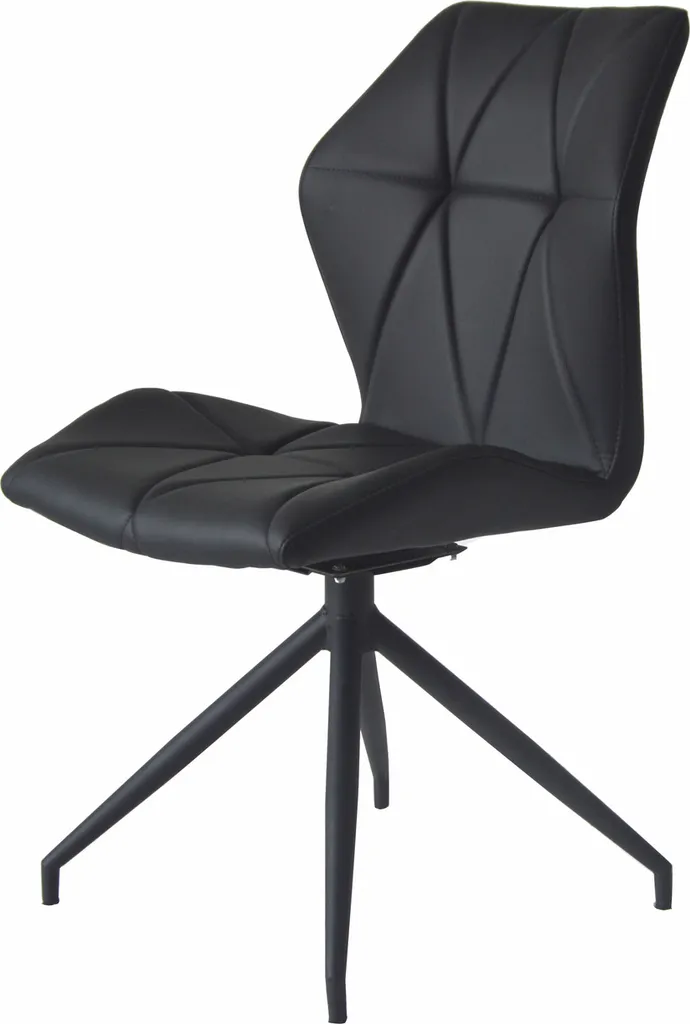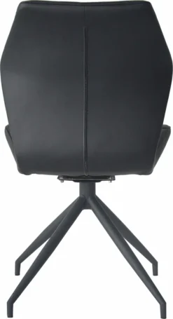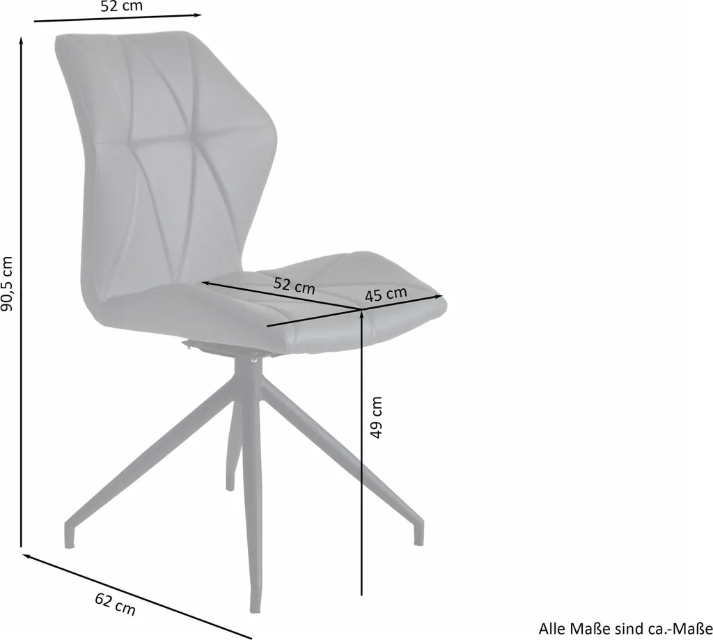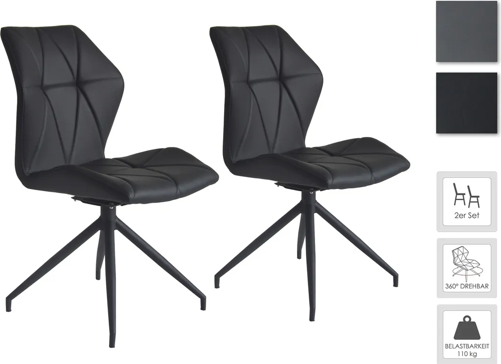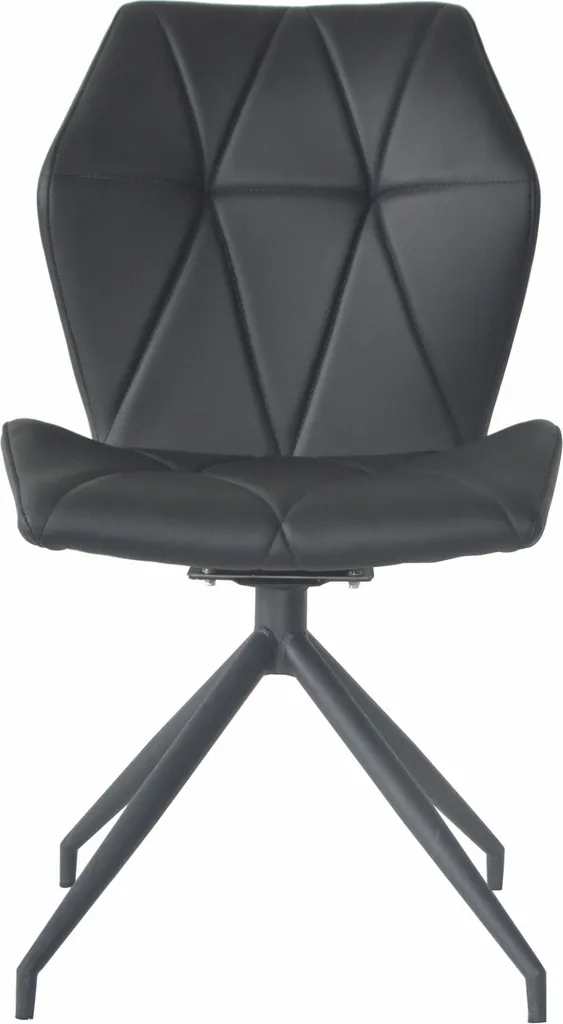 Der hochwertige Stuhl ist mit einem Kunstleder bezogen und hat in Rückenlehne sowie Sitzfläche eine moderne Diamanten-Steppung. Dies wird vom trendigen pulverbeschichtetem Gestell unterstrichen. Dank der guten Polsterung bietet der Stuhl einen hohen Sitzkomfort. Ein besonderer Clou ist die drehbare Sitzschale. Dank der 360 Grad Drehfunktion ist das Aufstehen vom Tisch ohne lästiges Stühlerücken möglich.