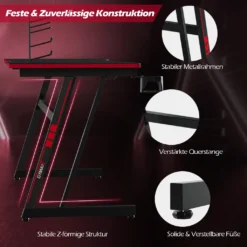 Durch die gekreuzten Streben und die Z-förmige Struktur hat der Tisch eine Tragkraft von 100 kg. Zudem lassen sich auf der großen Tischplatte Computer, Tastaturen, Dekoration, Bücher, etc. verstauen. Der Tisch besteht aus MDF, wodurch er sehr langlebig ist und eine leicht zu reinigende Oberfläche hat. Zudem hat er Halterungen für Kopfhörer und Gamepads sowie Getränke. Außerdem bietet die Tischplatte viel Platz für Computer und andere Gegenstände. Dadurch entsteht eine wirklich coole Atmosphäre.