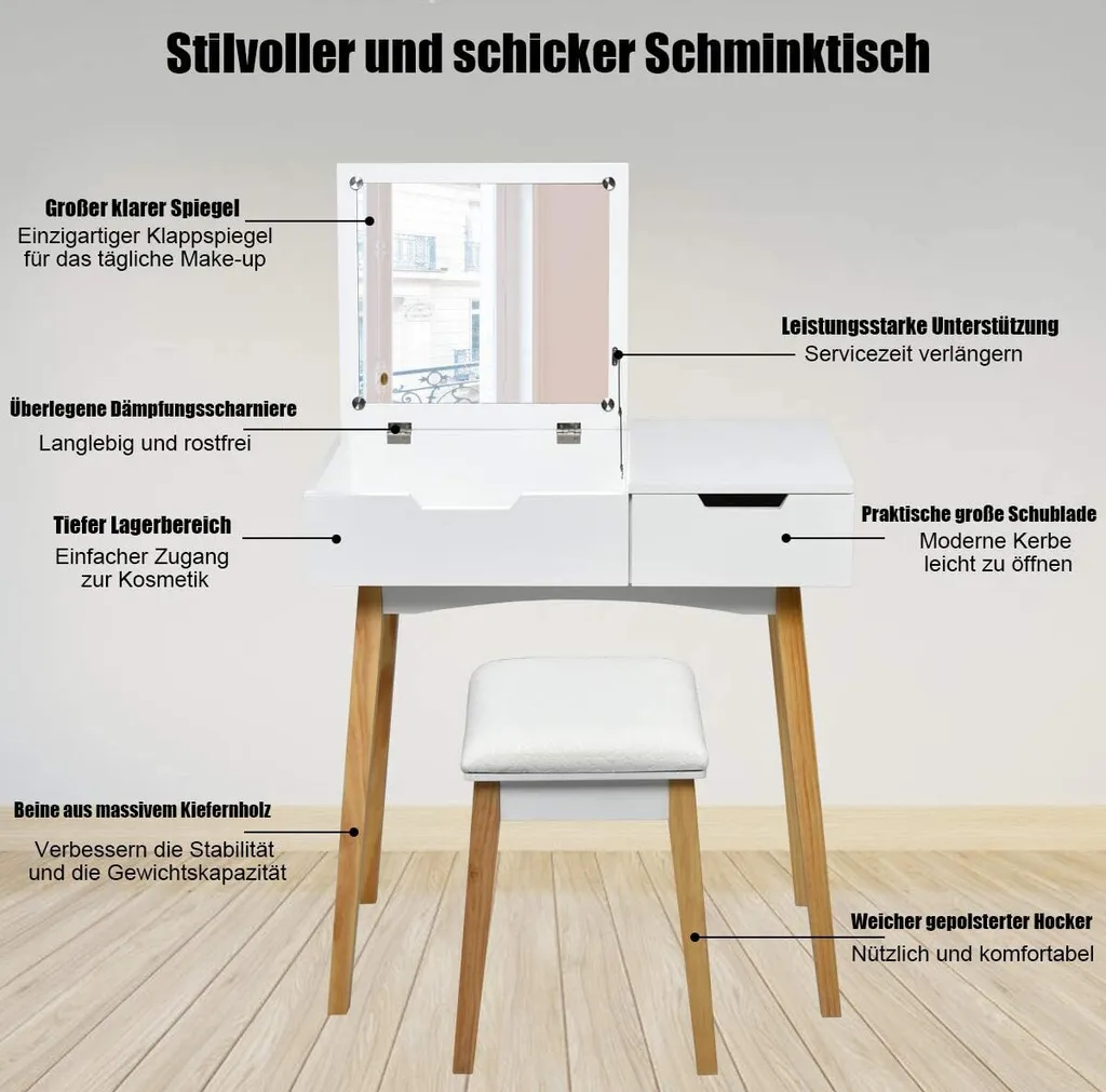 【Einzigartig schwenkbarer Spiegel】 Nicht nur kann der Tisch des Sets als Make-Up Tisch verwendet werden, sondern auch als Schreibtisch. Wenn Sie ihn öffnen, erscheint der Spiegel und ist verfügbar für das tägliche Frisieren. Wenn Sie den Deckel wieder schließen, dient er als einfacher Tisch oder Laptoptisch. Durch seine verschiedenen Funktionen wird Ihnen Platz gespart.