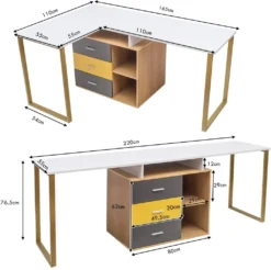 Seine 220 cm lange Tischplatte passt sich an die verschiedenen Bedürfnisse von 2 Personen an. Oder aber, Sie bauen ihn zu einem L-Förmigen Tisch um, sodass er in jede Ecke in Ihrem Raum passt. Ausgestattet mit einer geräumigen Tischplatte, 3 Schubladen und einem 2-stöckigen Regal bietet er genügend Stauraum für Computer, Drucker, Bücher, Pflanzen und vieles mehr. Außerdem ist diese doppelte Arbeitsstation aus Holzwerkstoff und einem Metallrahmen hergestellt, was besonders stabil und widerstandsfähig ist. Sie können ihn als 2-Personen Schreibtisch, Bürotisch, ebenso wie als Gaming Tisch verwenden. Dies macht ihn ideal fürs Schlafzimmer, Arbeitszimmer und Büro.