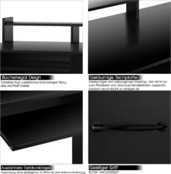 Wenn Sie einen Tisch zum Arbeiten oder Lernen brauchen, dann ist dieser Computertisch aus Spanplatten, in schlichtem Stil, genau das Richtige für Sie. Er zeichnet sich durch sein Kompaktes Design aus, wobei er gleichzeitig Raum für alle Dinge bietet, die Sie brauchen, um Ihre Aufgaben und Projekte zu vollenden. Die Oberfläche des Computertisches ist schwarz und glatt, mit zwei Regalen darauf, in denen Sie Bücher und Pflanzen platzieren können. Unter dem Tisch befindet sich eine herausziehbare Tastaturablage, welche sie für Tastatur und Maus verwenden können. An der rechten Seite des Tisches ist ebenfalls eine Schublade angebracht, in der Sie Bürobedarf und nützliches Zubehör lagern können. Außerdem sind unter dem Tisch ebenfalls noch zusätzliche Bücherregale vorhanden, in denen Sie größere Sachbücher, Drucker oder einen Stand-PC verstauen können.