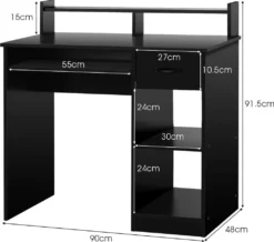 Unser Tisch ist mit einer offenen Tastaturablage unter der Tischplatte, einer herausziehbaren Schublade und 2 großen Regalbrettern ausgestattet. Damit bietet er genügend Platz für Bürobedarf, Bücher und einige persönliche Gegenstände. Außerdem kann der Stand-PC auf dem unteren Regalbrett platziert werden, wenn die mittlere Stange nicht installiert ist.