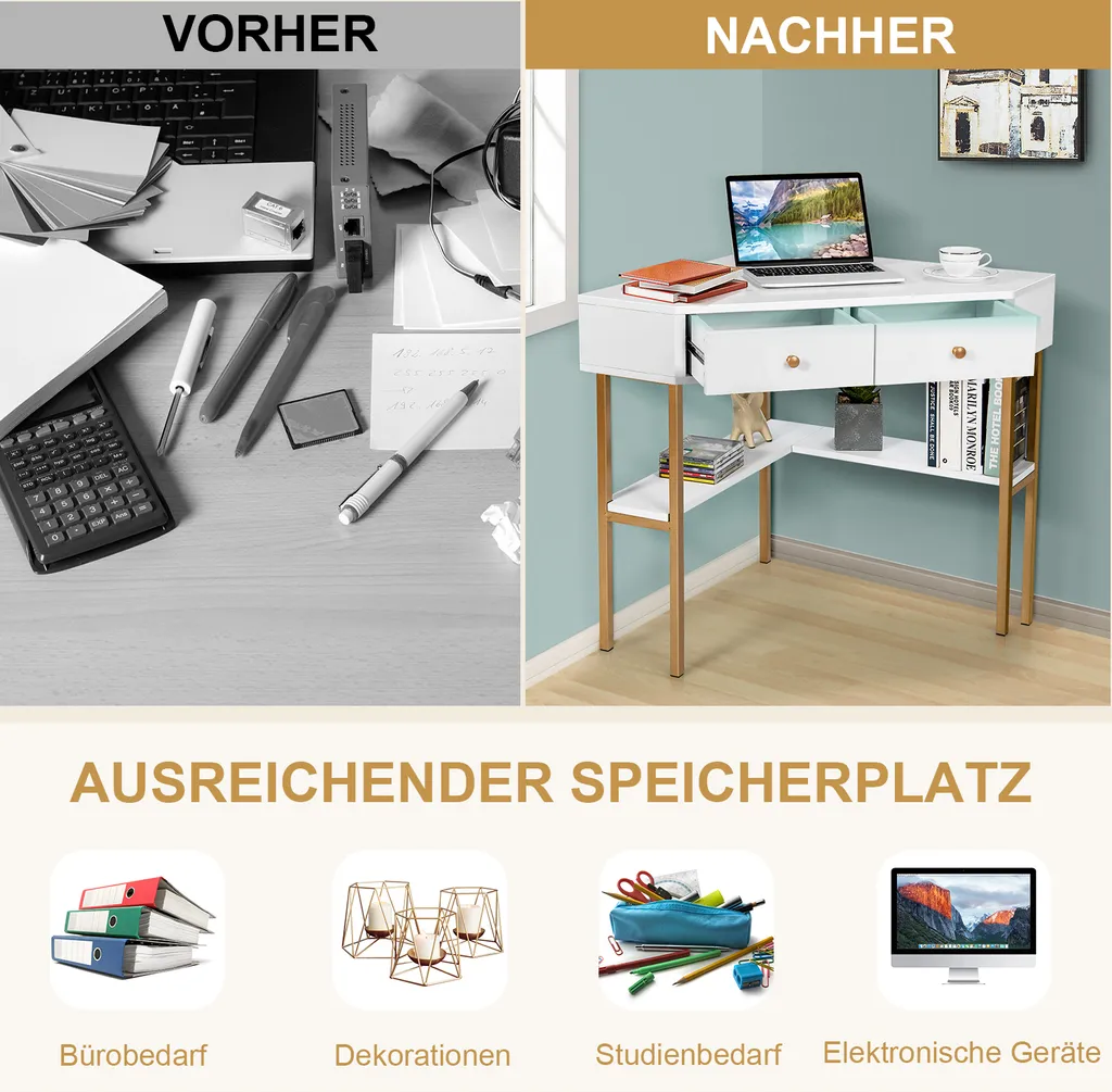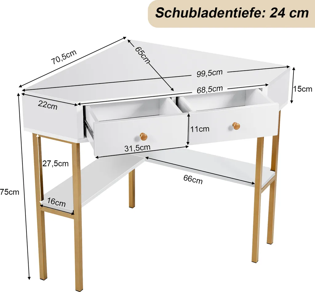 Unser Modell ist platzsparender als die meisten anderen. Da er in Ecken platziert werden kann, ist eine besonders praktische Nutzung möglich. Mit zwei Schubladen und mehreren Ablagen steht Ihnen viel Stauraum zur Verfügung. Die Gesamtstruktur ist sehr robust und langlebig. Dank der 4 Beine steht er sehr stabil. Dank der praktischen Griffe und Schienen lassen sich die Schubladen leicht herausziehen.