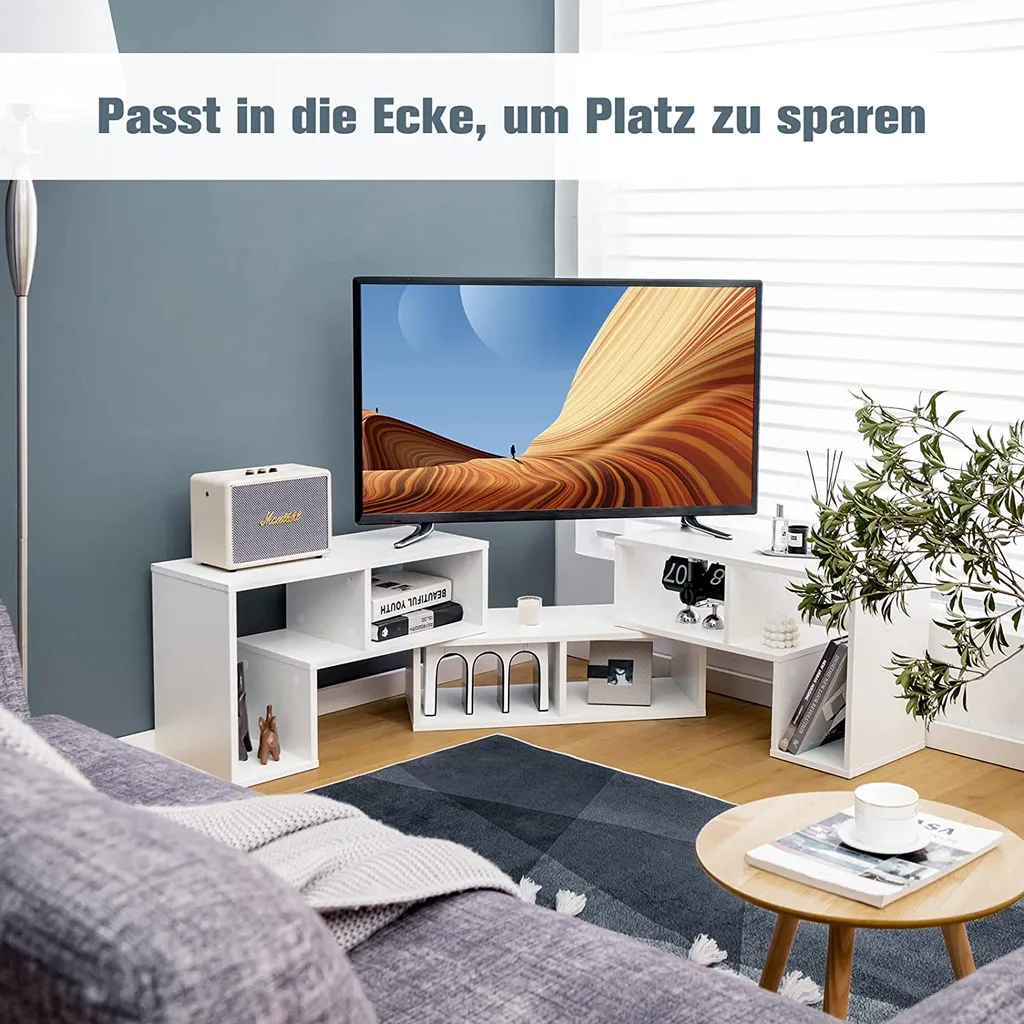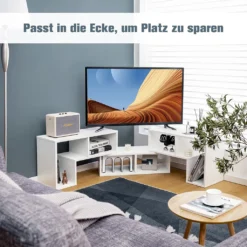 Die moderne TV-Konsole ist in 3 Teilen erhältlich, darunter 2 L-förmige Regale und ein rechteckiges Regal, die für verschiedene Zwecke auf vielfältige Weise kombiniert werden können. Beispielsweise können die 2 L-förmigen Regale auf dem rechteckigen platziert werden, dann von 140 cm auf 180 cm erweitert oder in verschiedenen Winkeln gedreht werden.