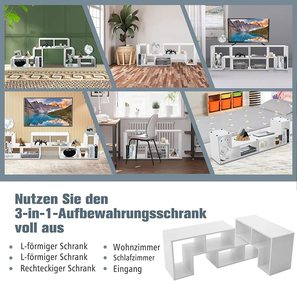 Lassen Sie uns die endlosen Möglichkeiten des 3-teiligen TV-Regals erkunden! Das Produkt verfügt über freie Kombinationen, von denen die gängigsten 3 Stile in den Bildern gezeigt wurden. Da die 2 L-förmigen Regale auf dem rechteckigen gestapelt sind, können sie erweitert oder gedreht werden, um verschiedenen Anforderungen gerecht zu werden. Daher können Sie es als niedrigen TV-Konsolentisch, Eckschrank oder stehendes Präsentationsregal verwenden. Außerdem bieten die 6 verschiedenen Fächer eine geordnete Aufbewahrungslösung für verschiedene Elektronik, Bücher und andere Ornamente. Darüber hinaus sind die gut konstruierten Regale ziemlich robust und langlebig und rutschfeste Pads sind ebenfalls für eine verstärkte Stabilität enthalten. Übrigens hat der Fernsehschrank ein sauberes und minimalistisches Aussehen, wobei die Schraubenlöcher mit Aufklebern bedeckt sind.