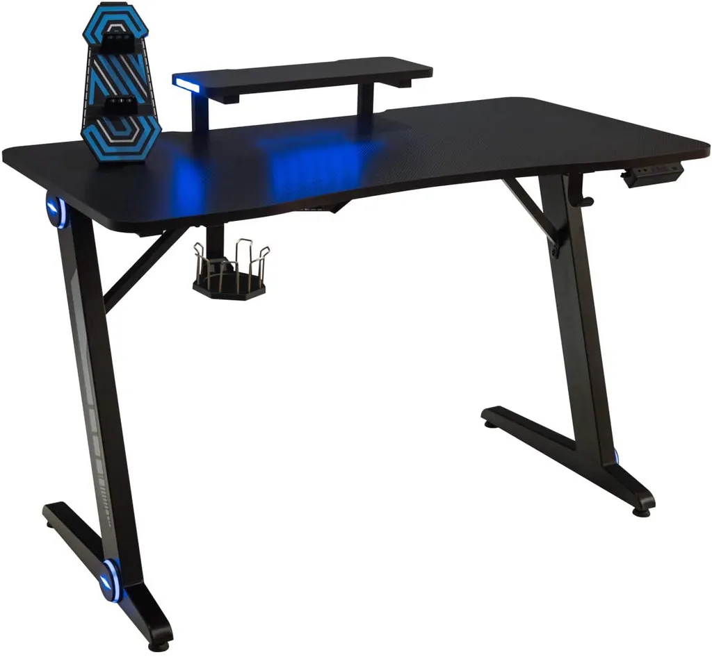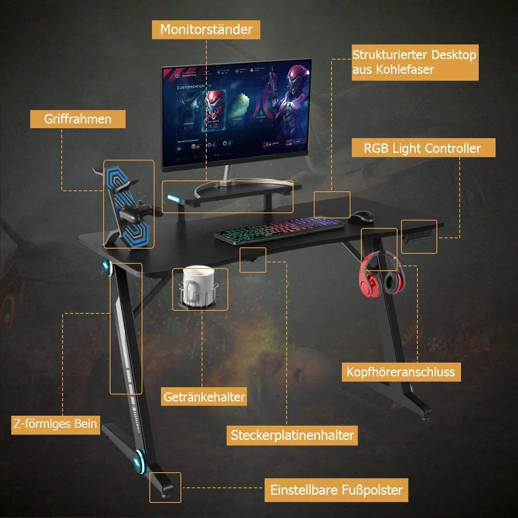 Seien Sie bereit für eine komplett neue Gaming Erfahrung. Dieser Gaming Tisch passt perfekt zu der Art, wie Sie spielen. Mit einer 120cm x 60cm Tischoberfläche, haben Sie ausreichend Platz, für Ihre Gaming Ausrüstung und Ihre Maus kann ohne Probleme über die glatte Oberfläche gleiten. Der Gaming Tisch besitzt RGB Lichter, um ein besseres Gaming Erlebnis zu bieten und eine bessere Gaming Atmosphäre. Gefertigt in der Z-förmigen Struktur und aus hochwertigem Material, besitzt der Gaming Tisch eine hohe Belastbarkeit und Stabilität. Sie können Ihn verwenden und dabei all Ihr kostbares Gaming Equipment darauf lagern. Praktischerweise besitzt der Tisch ebenfalls einen Becherhalter, Kopfhörerhaken, Griffrahmen und eine Steckerleisten Halterung, um die Gaming Erfahrung bequemer zu machen. All diese Extras sind für Gamer entworfen worden, um Ihnen so viele Annehmlichkeiten wie möglich zu bieten.