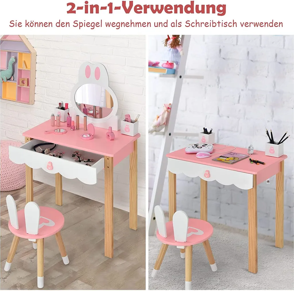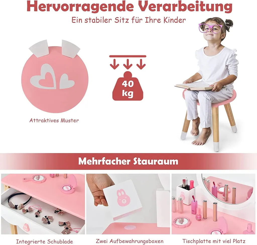 Der Tisch kann nicht nur zum Schminken genutzt werden, sondern bei abgenommenem Spiegel auch als Schreibtisch. Durch dasrosa/weißeDesign ist es eine niedliche Ergänzung fürs Kinderzimmer.