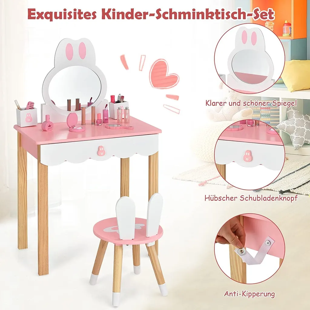Sowohl der Spiegel als auch die Lehne sind hasenförmig und daher sehr niedlich. Im klaren Spiegelglas können sich die Kleinen wunderbar betrachten, sowie schminken und frisieren.