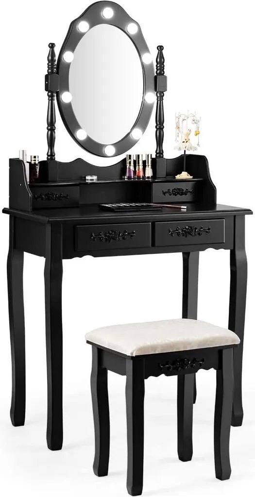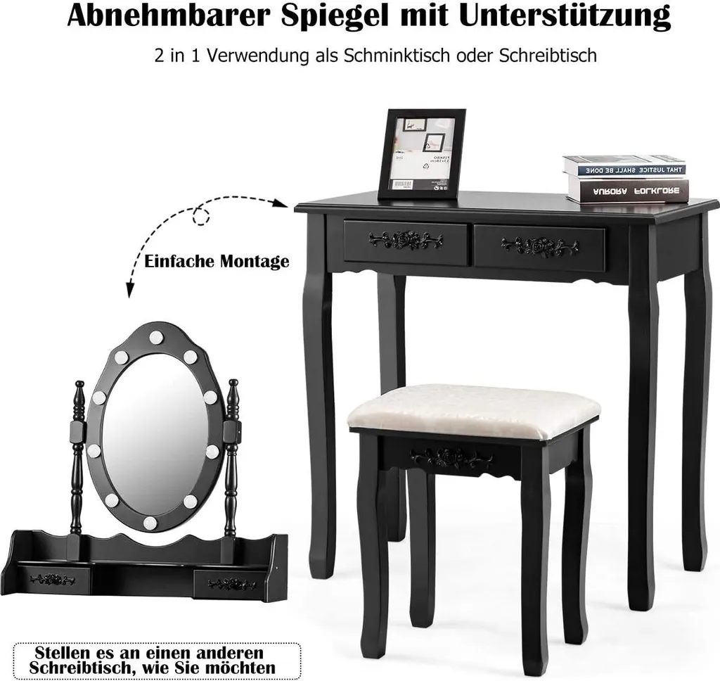 Mit 2 großen und 2 kleinen Tischschubladen und einem zusätzlichen Ablagefach können Sie Ihre Schminkutensilien ordentlich verstauen. Kosmetika finden in den großen Schubladen, Nagellack, Schmuck, Haarnadeln und andere kleine Gegenstände in kleinen Schubladen ihren Platz.