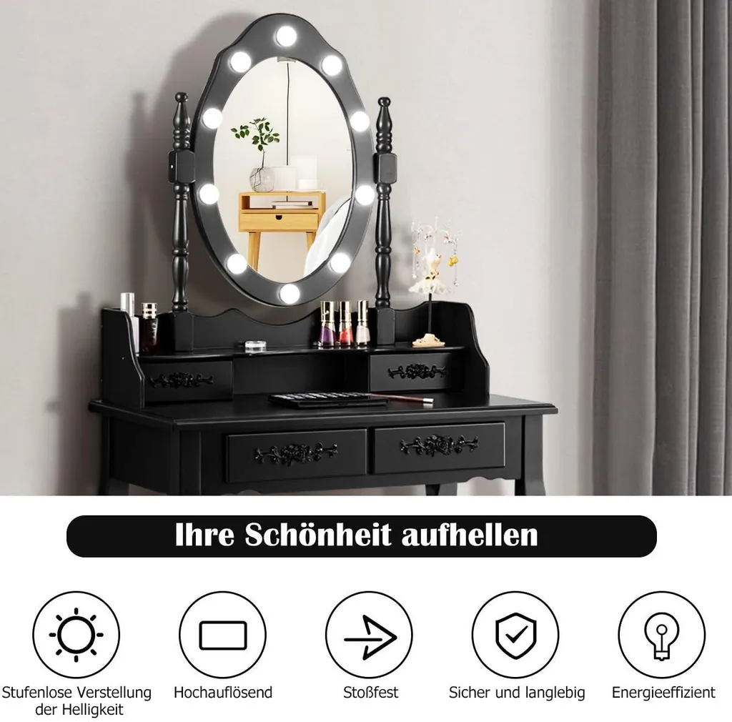 Machen Sie sich frisch und beginnen Sie den Tag mit dem hochauflösenden Spiegel. Mit seinem abnehmbaren Teil können Sie ihn sofort in einen Schreibtisch verwandeln. Die 10 um den Spiegel laufenden Lichter sind ein dekorativer Hit in Ihrem Zimmer und sorgen stets für ausreichende Beleuchtung beim Schminken!