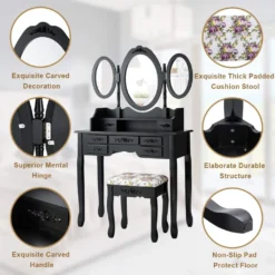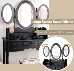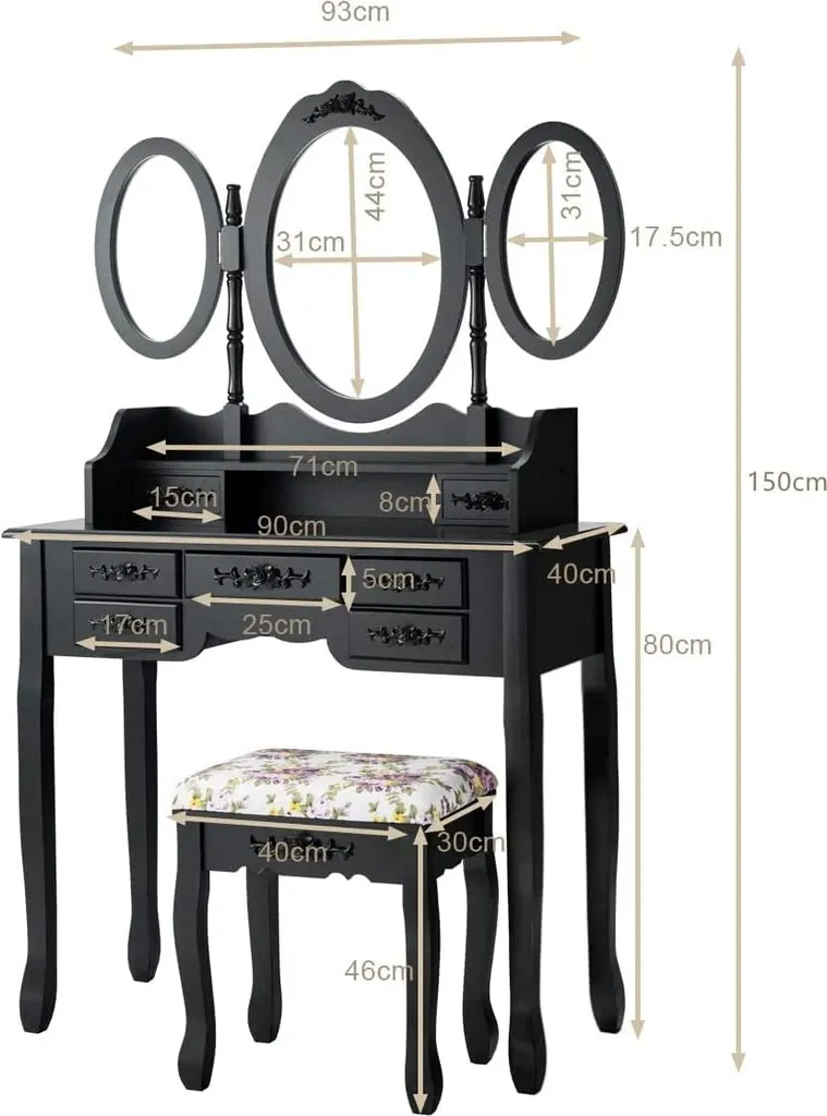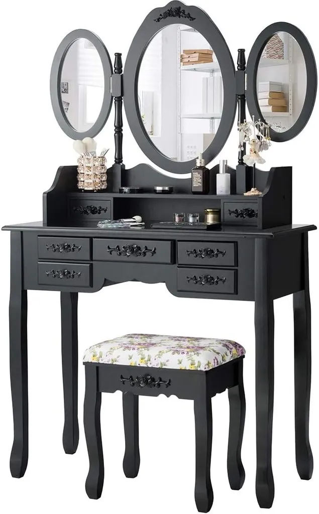 Aus hochwertigem Paulowniaholz gefertigt ist es äußerst robust und langlebig. Der Tisch kann bis zu 130 kg tragen und der Hocker bis zu 110 kg. Abgesehen davon bieten Ihnen die 7 Schubladen und das Regal viel Stauraum für Schmuck und andere Kleinigkeiten. Der Tisch ist mit drei Makeup-Spiegeln ausgestattet. Die beiden äußeren Spiegel lassen sich zudem drehen und auf Wunsch abklappen. Durch die hübschen Verzierungen und die dekorative Polsterung wirkt das Set sehr elegant. Es ist daher eine perfekte Ergänzung für Ihr Zuhause.
