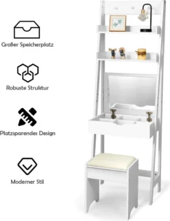 Das elegante und minimalistische Weiß passt zu jedem Raumdekor und auch bei beengten Platzverhältnissen. Dieser Schminktisch kann nicht nur in Sekundenschnelle in einen Schreibtisch oder Laptop-Tisch verwandelt werden kann, sondern auch als Nachttisch oder kleines Bücherregal neben dem Bett aufgestellt werden.