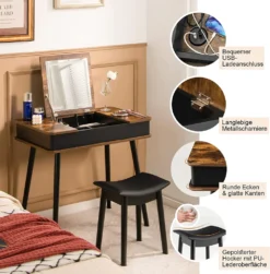 Dieser Schminktisch mit aufklappbarem Spiegeldesign kann auch als Schreibtisch dienen und erfüllt Ihre Bedürfnisse sowohl für Make-up als auch für die Arbeit. Außerdem bieten 6 Fächer unter dem Schreibtisch viel Stauraum, um Ihre Kosmetika, Schmuck, Uhren, Parfums, Schminkutensilien usw. gut organisiert aufzubewahren.