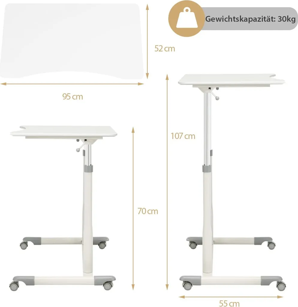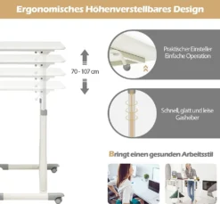 Als eine Verbindung von eleganter Optick und Zweckmäßigkeit ist dieser Laptoptisch ideal für Zuhaus und Büro. Die Höhe kann von 70 cm bis 107 cm eingestellt werden, womit der Tisch Ihre verschiedenen Bedürfnisse decken kann. Der Tisch besteht aus MDF von guter Qualität mit PVC Auflage und pulverbeschichteten Metallrohren. Deshalb ist er robust, fäulnisbeständig sowie rostfrei und verfügt über eine lange Lebensdauer. Mit 4 Rollen lässt der Tisch sich leicht bewegen. Sie können den Tisch als nicht nur Computertisch, sondern auch Esstisch, Kaffeetisch usw. benutzen.