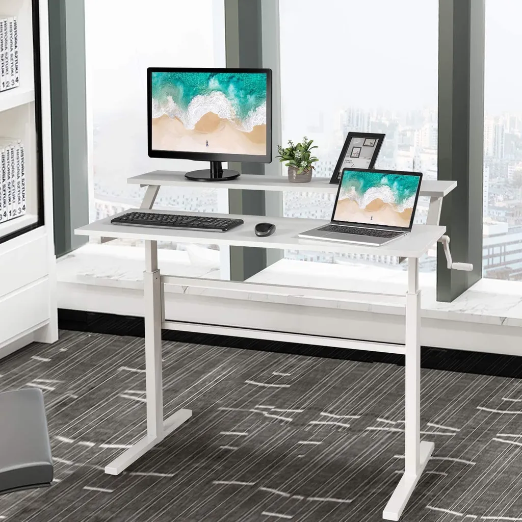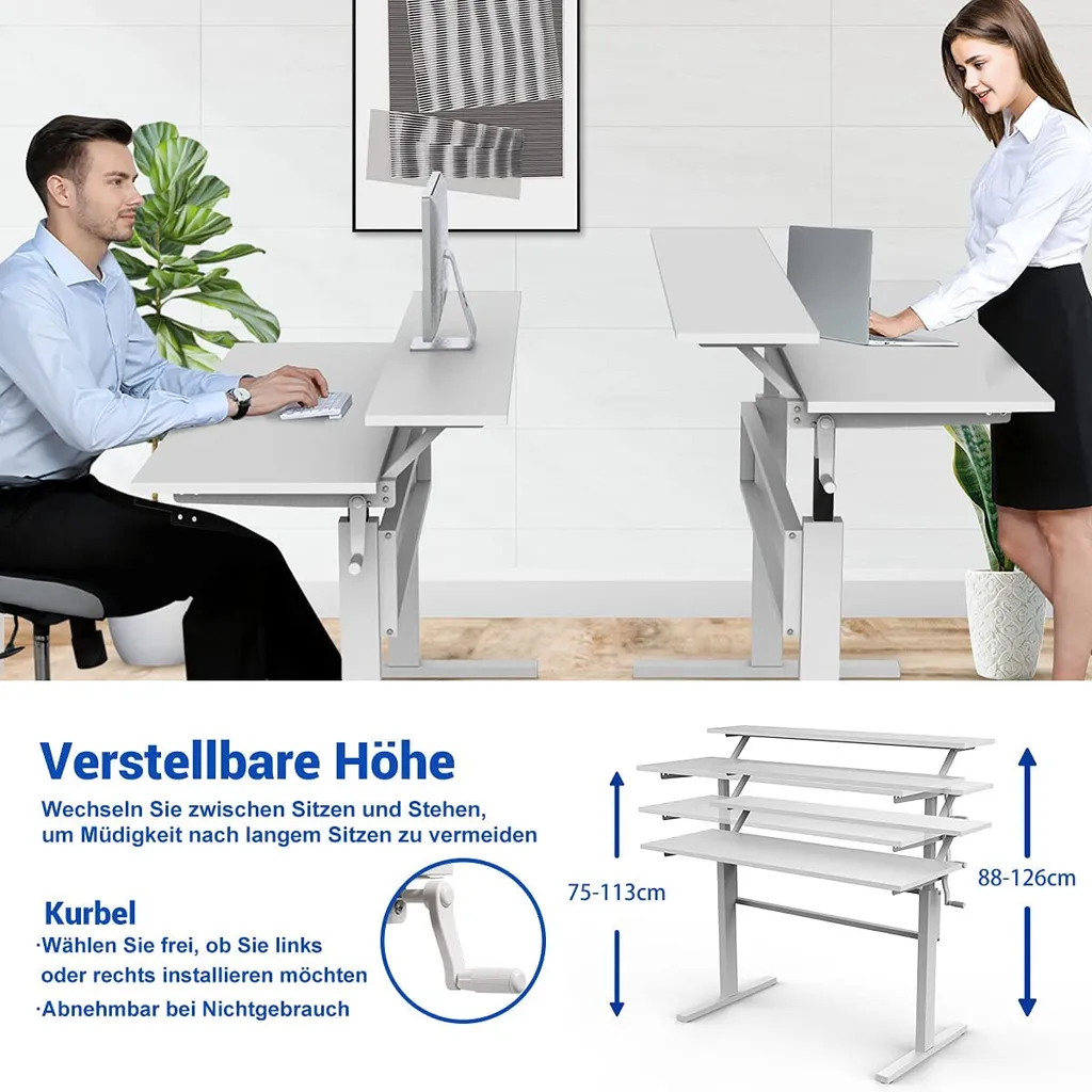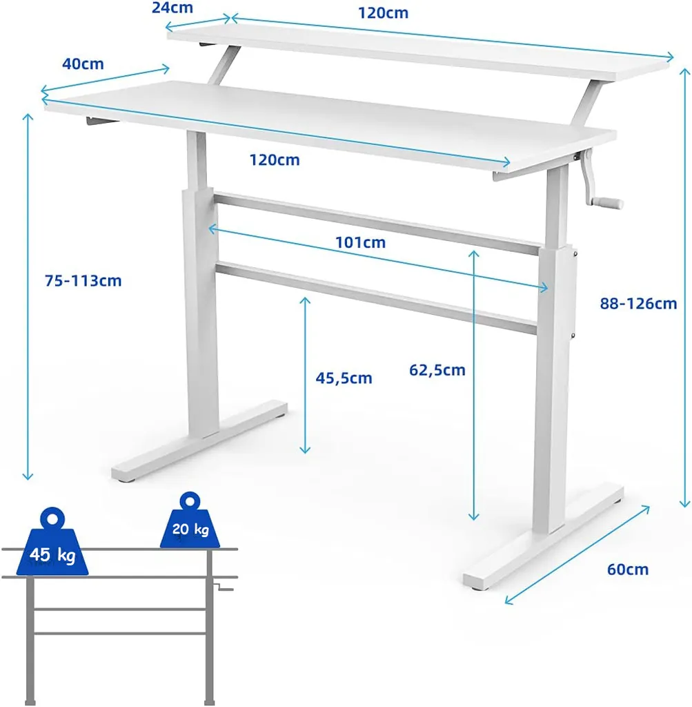 Gefertigt aus ausgewähltem MDF und hoch belastbarem Stahlrahmen, ist dieser Stehtisch robust, widerstandsfähig gegenüber Rost und langlebig. Dank der faltbaren Handkurbel kann der ergonomische Tisch einfach zwischen einer Sitz- und Stehposition verstellt werden (75 cm – 113 cm). Dieses einstellbare Design wird dafür sorgen, dass Sie noch mehr Komfort bei der Arbeit genießen können und Ihre Haltung flexibler ist, wodurch Ihre Aufmerksamkeit und Produktivität erhöht werden. Das Monitor Regal sorgt für noch mehr Ablagefläche für Ihren Computer und hält ihn auf Augenhöhe, um so Nackenschmerzen vorzubeugen. Mit seinem schlichten und eleganten Stil ist der Tisch ideal für Schlafzimmer, Arbeitszimmer, Büro, etc. geeignet.