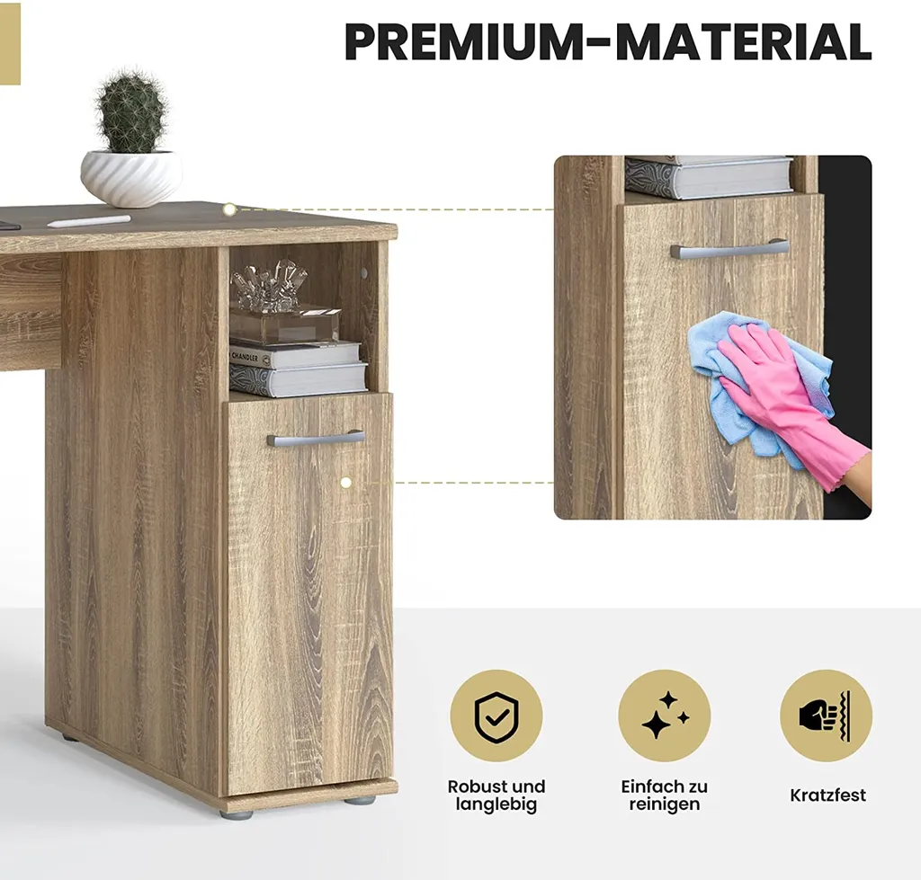 Der Computertisch besteht aus hochwertigen Holzwerkstoffen, wodurch er robust und langfristig einsetzbar ist. Außerdem hat er eine hohe Tragkraft und kann Gegenstände mit einem Gewicht von bis zu 40 kg tragen.