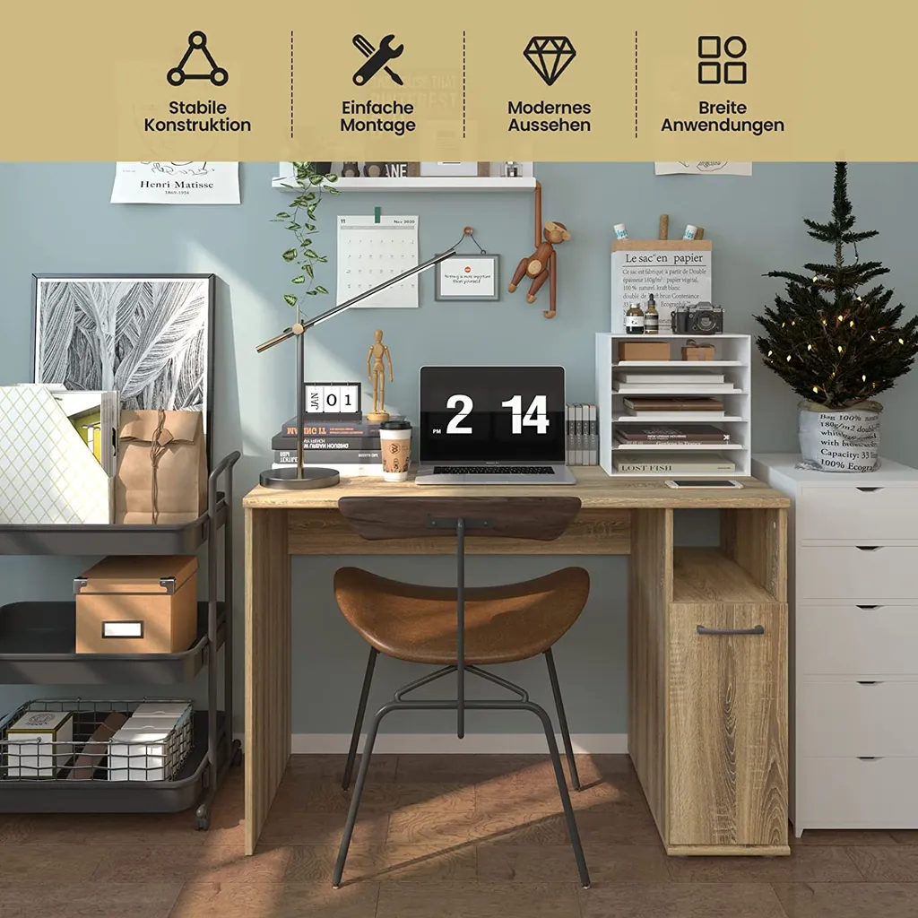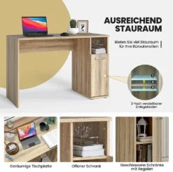 Ihnen wird viel Stauraum für Laptop, Tastatur oder sogar Grünpflanzen geboten. Das Fach im Schrank kann dreistufig verstellt werden, um auch große Gegenstände darin aufbewahren zu können. So lässt sich beispielsweise der PC hineinstellen. Aus hochwertigen Holzwerkstoffen gefertigt ist der Tisch stabil und tragfähig. Außerdem ist er praktisch, modern und einfach eine rundum tolle Ergänzung für Ihr Zuhause.