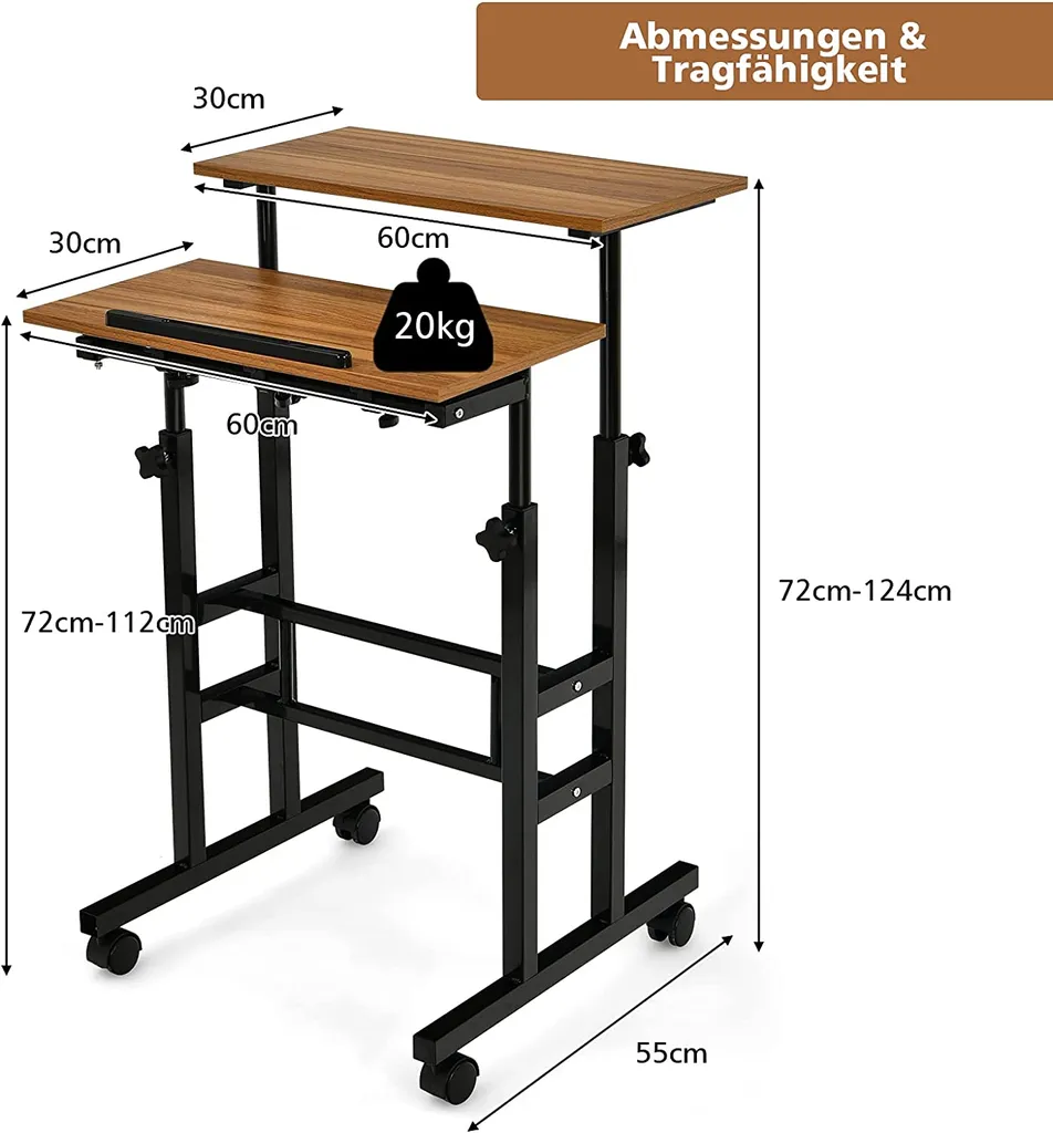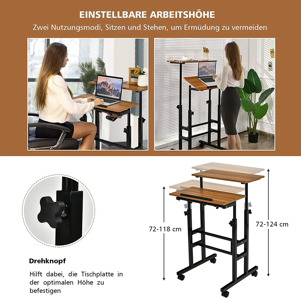 Dank des ergonomischen und höhenverstellbaren Designs können Sie je nach Wahl beim Arbeiten sitzen oder stehen. Die obere Ablage kann von 72 – 124cm verstellt werden, und die untere von 72 cm bis 118 cm.