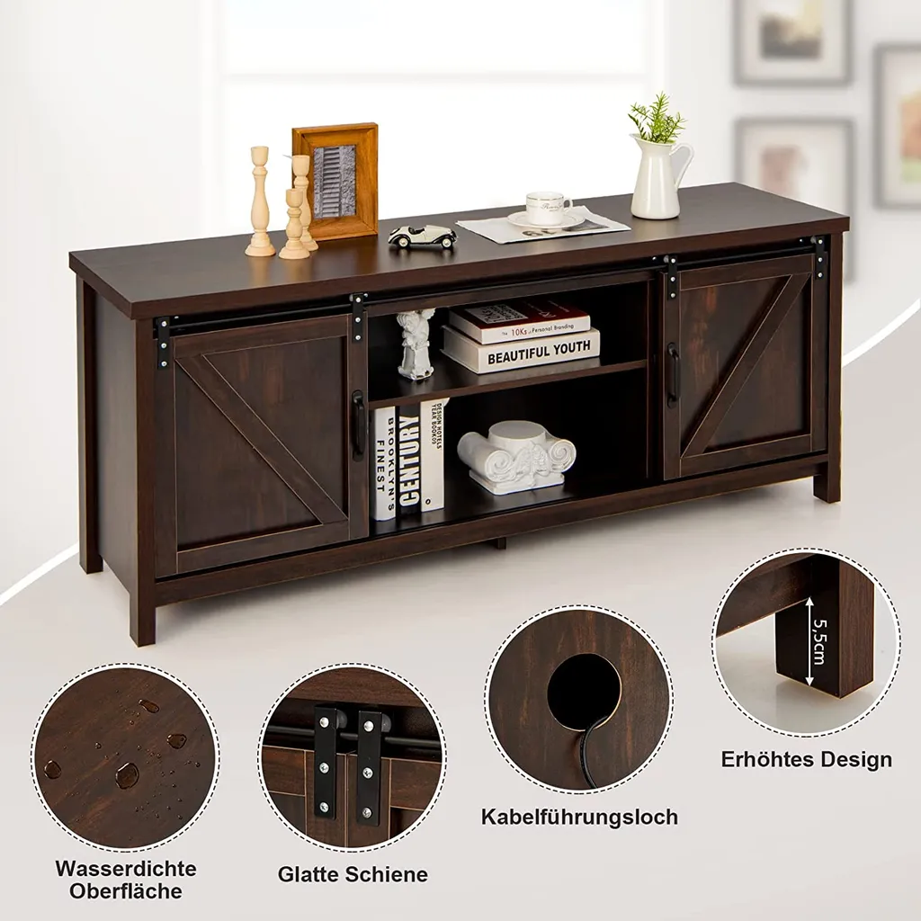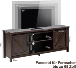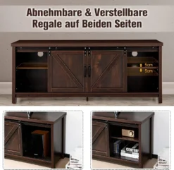 Verleihen Sie Ihrem Zuhause mit diesem modernen Bauernhaus-TV-Ständer mehr Charme! Die rustikale Holzmaserung und das moderne Metall verleihen diesem Unterhaltungscenter einen auffälligen Touch, der sich nahtlos in Ihre Inneneinrichtung einfügt. Abgesehen davon, dass Sie den 65-Zoll-Fernseher und andere Gegenstände auf die Oberseite stellen, können Sie die Schiebetüren öffnen, um mehr Gegenstände in den Regalen zu verstauen. Darüber hinaus können die Regale auf beiden Seiten separat auf 3 verschiedene Höhen eingestellt werden, sodass Gegenstände unterschiedlicher Größe hervorragend passen. Durch den großzügigen Stauraum dient dieses Indoor-Möbel daher nicht nur als TV-Ständer, sondern kann auch als Konsolentisch oder Aufbewahrungsschrank verwendet werden.