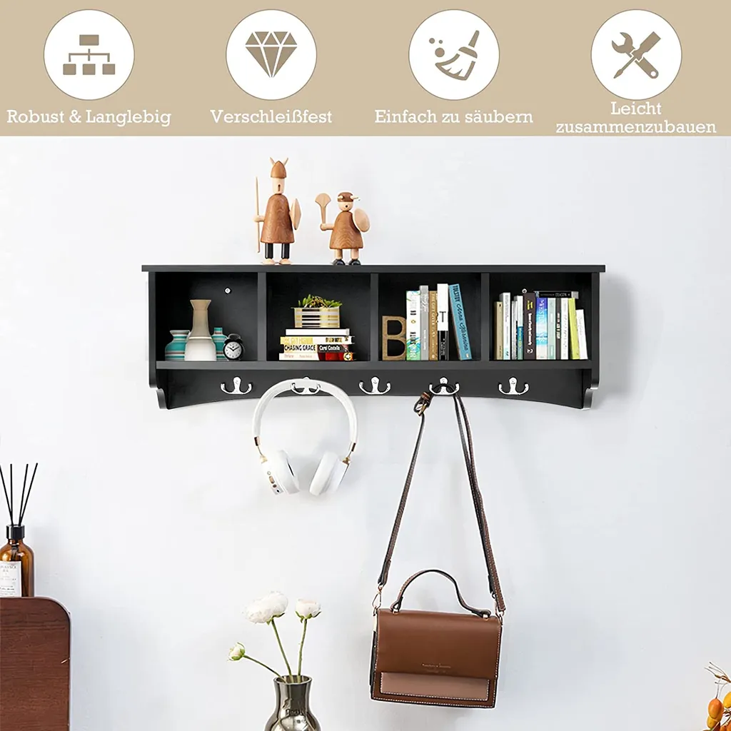 Vier Fächer bieten Platz für Bücher, Flaschen und andere Dinge, die dort sortiert verstaut werden können. An den fünf Haken können Taschen, Jacken oder Regenschirme aufgehangen werden.