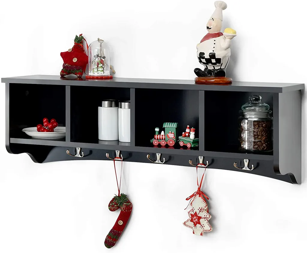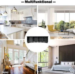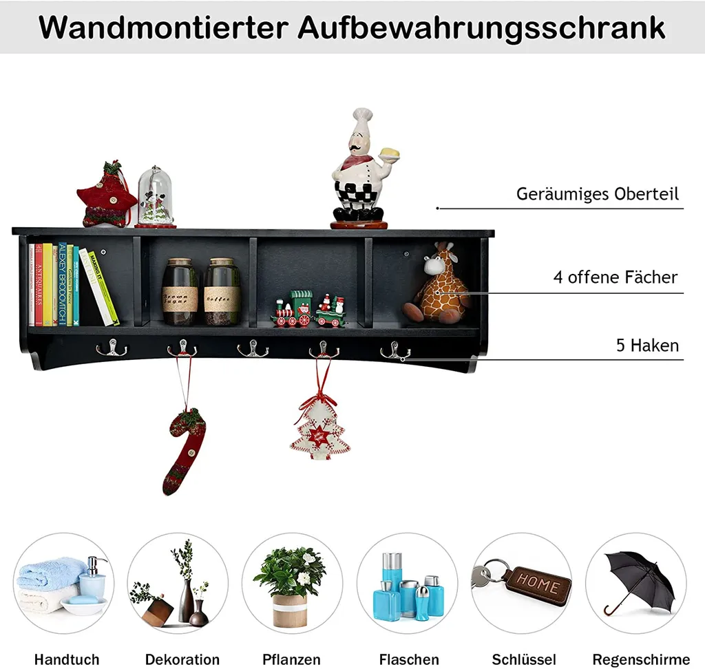 Suchen Sie noch eine Garderobe zur Wandmontage, um Platz zu sparen? Dann ist unser Modell eine ideale Wahl. 4 Fächer bieten Ihnen Platz für alle möglichen Dinge, und an den 5 Haken können Mäntel, Schlüssel oder Schirme aufgehangen werden. Durch die hochwertigen Spanplatten ist die Struktur robust und langlebig. Die Garderobe ist modern und passt daher perfekt zu jeglicher Einrichtung in Wohnzimmer, Küche, Schlafzimmer oder Bad. Außerdem nimmt sie keine Bodenfläche in Anspruch. Dank der Anleitung und dem mitgelieferten Zubehör gelingt Ihnen die Montage schnell und einfach.