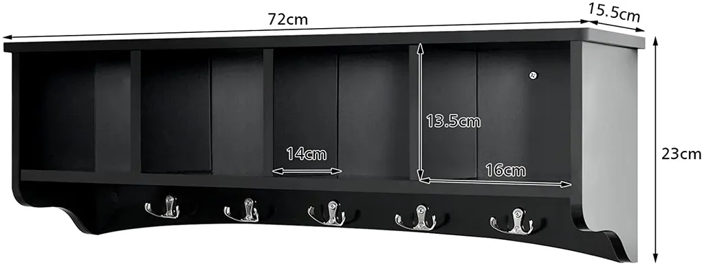 Durch die Wandmontage nimmt die Garderobe keine Bodenfläche ein. Sie misst 72 cm x 15 cm x 23 cm und ist auch relativ leicht, sodass Ihnen der Aufbau in Küche, Flur oder Schlafzimmer leichtfallen wird.