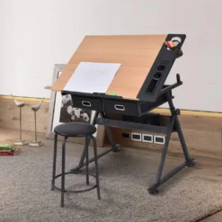 Unser hochwertiger Tisch mit doppelter Arbeitsfläche ist besonders für Zeichner geeignet. Man kann beispielsweise PC und Zeichenfläche gleichzeitig nutzen. Mit zwei Schubladen bietet er genügend Stauraum für Ihre Zeichenutensilien. Der mitgelieferte Stuhl ist dick gepolstert, damit Sie beim Arbeiten bequem sitzen können.