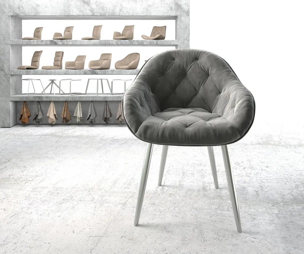 Sitzschale Gaio überzeugt durch die gewölbte Form und einer durchgehenden Armlehne mit hohem Sitzkomfort. Die dezenten und stilvollen Absteppungen an der Lehne machen den Stuhl zum Highlight im Esszimmer. Der edle Glanz von weichem Samt macht einen Stuhl zu etwas ganz Besonderem. Moderne Samtstoffe sind robust und widerstandsfähig und deshalb ausgezeichnet für die aktuellen Stuhldesigns geeignet.Esszimmerstuhl Gaio Samt Grau – die perfekte SitzgelegenheitDer elegante 4-Fuß ist besonders standfest und durch sein einfach gehaltenes Design ein zeitloser Klassiker der mit vielen Wohnstilen kombiniert werden kann. Das Stuhlgestell wurde aus hochwertigem, handgebürstetem Edelstahl hergestellt. Durch das Bürstenverfahren glänzt das Gestell in edler Optik und ist besonders widerstandsfähig gegen Rost und Verschleiß.