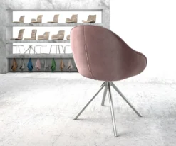 Die Sitzschale Gaio überzeugt durch die gewölbte Form und einer durchgehenden Armlehne mit hohem Sitzkomfort. Die dezenten und stilvollen Absteppungen an der Lehne machen den Stuhl zum Highlight im Esszimmer.Der Samtstoff in trendigem Rosé überzeugt durch eine Oberfläche mit leichtem Glanz und einer samtweichen Haptik. Dank neuer Herstellungsverfahren und einer guten Verarbeitung ist der einst als so empfindlich geltende Samt heute ein durchaus widerstandfähiger Stoff, der sich auch für Stühle eignet.Esszimmerstuhl Gaio Samt Rosé – die perfekte SitzgelegenheitDie vier runden Füße dieses formschönen Kreuzgestell sorgen für besonderen sicheren Stand. Die zusätzliche Drehfunktion bis zu 180 Grad ist nicht nur herrlich praktisch sondern vor allem bei längeren Gesprächen am Tisch schonend für Hals- und Rückenwirbel.Das Stuhlgestell wurde aus hochwertigem, handgebürstetem Edelstahl hergestellt. Durch das Bürstenverfahren glänzt das Gestell in edler Optik und ist besonders widerstandsfähig gegen Rost und Verschleiß.
